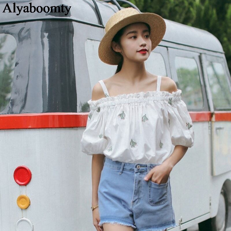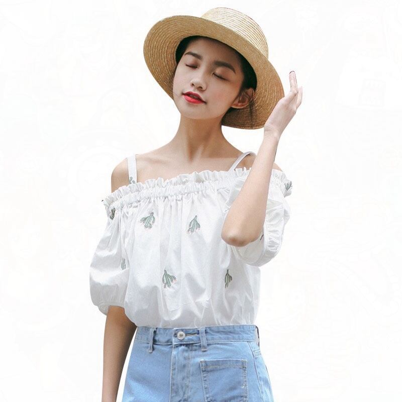 送料無料୨♥୧ 2021森サマーレディース可愛いホワイトトップス スラッシュ首オフショルダーコットンティーシャツ 刺繍カクタスTシャツ AOS41835264510