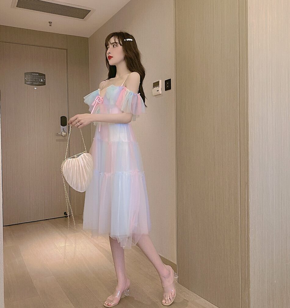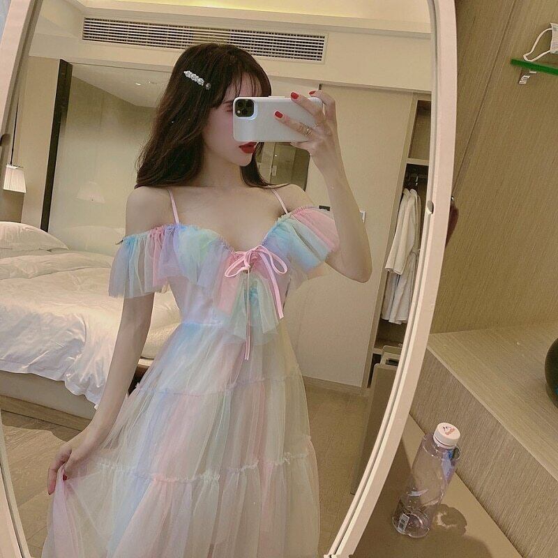 送料無料୨♥୧ サマーレディースロリータパーティードレス Vネック妖精チュールオフショルダー可愛いペスタルメッシュ AOS55137094154