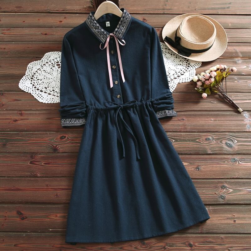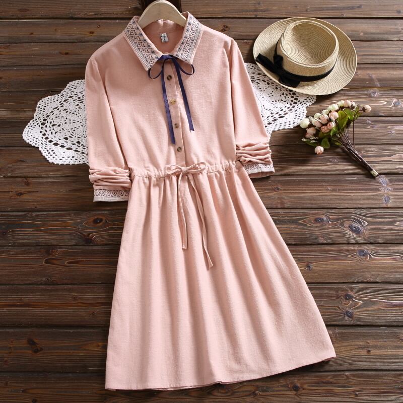 送料無料୨♥୧ 2021森スプリングオータムレディースピンクネイビーブルードレス 断るカラーリボンレースアップベスティドス刺繍コットンヴィンテージ AOS41249817664