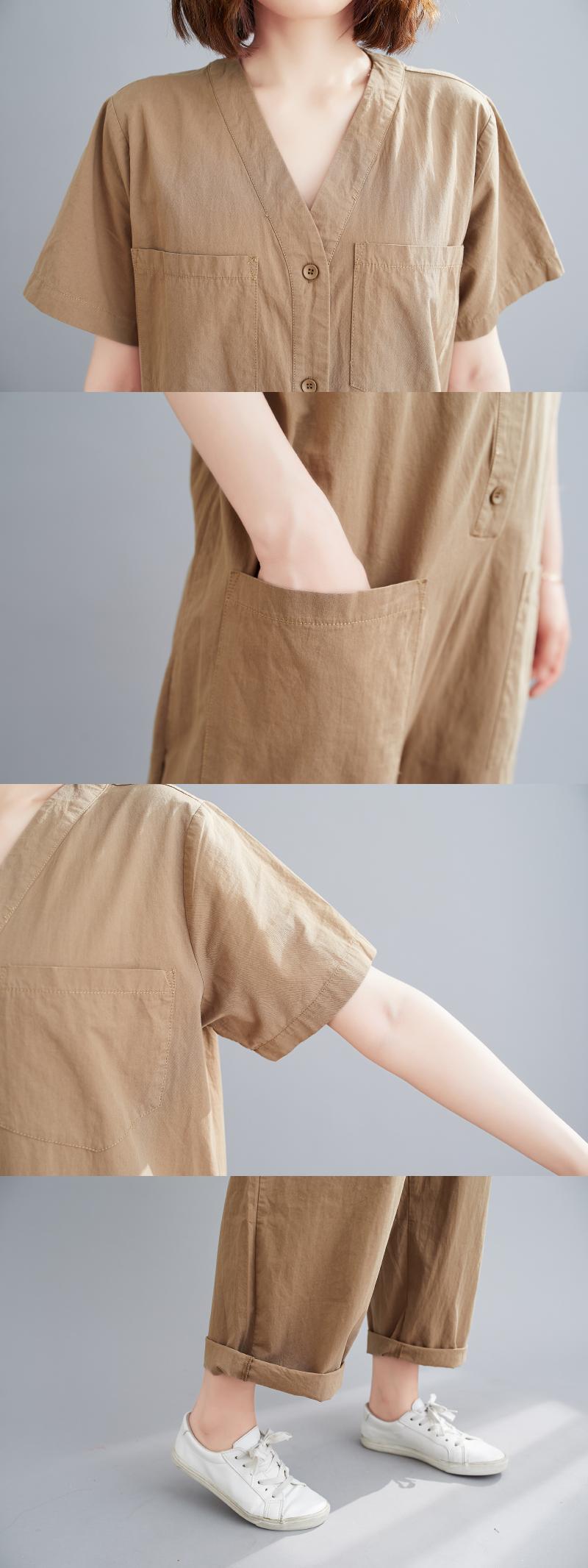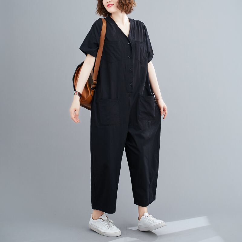 送料無料୨♥୧ プラスサイズレディースジャンプスーツ オールインワン ロングパンツ ズボンルーズコットンソリッド ボタンレディ AOS93515204467