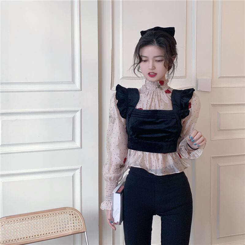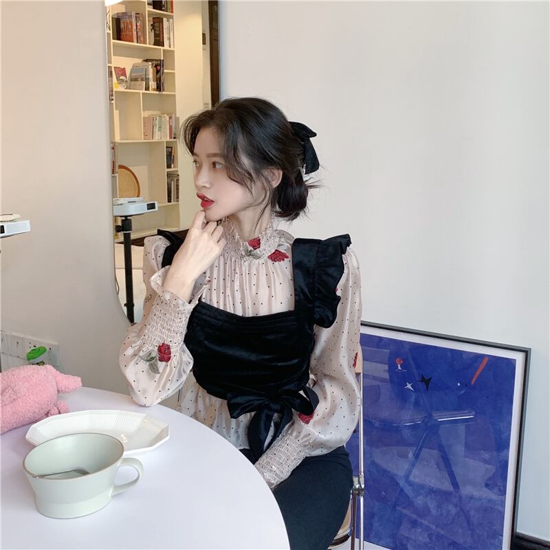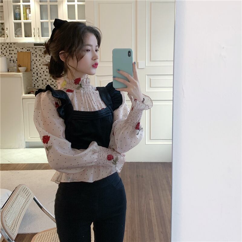 送料無料୨♥୧ シックスプリングサマーレディース2枚収穫トップス カラー水玉刺繍フローラルシャツ セット ゴージャスレディブラウス AOS63006950263