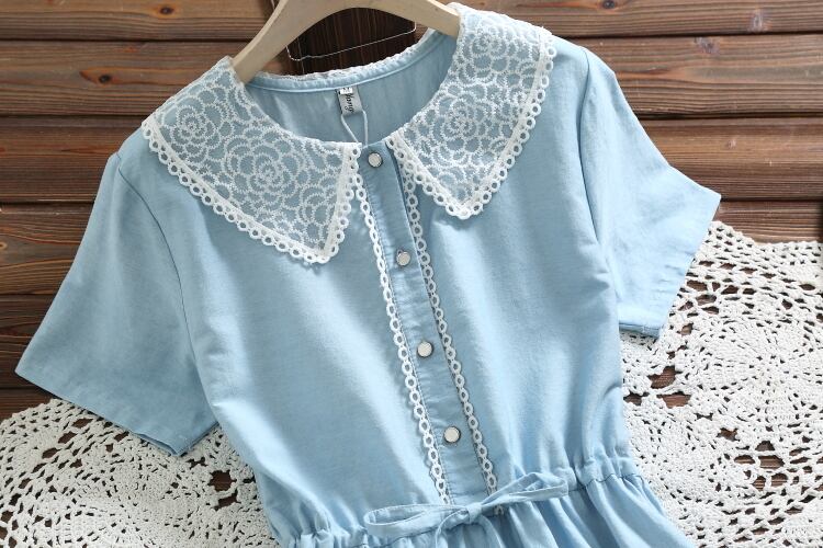 送料無料୨♥୧ 2021ese森サマーレディースブルードレス ピーターパンカラーとレースデニム半袖スリーブフリル可愛い AOS92171751471