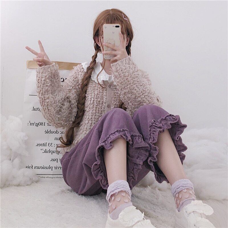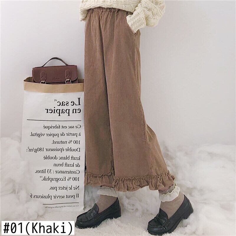 送料無料୨♥୧ ese秋ウィンターレディースロリータスタイルパンツ 紫のカーキコーデュロイワイドレッグプレッピー可愛いフリル AOS41601054712