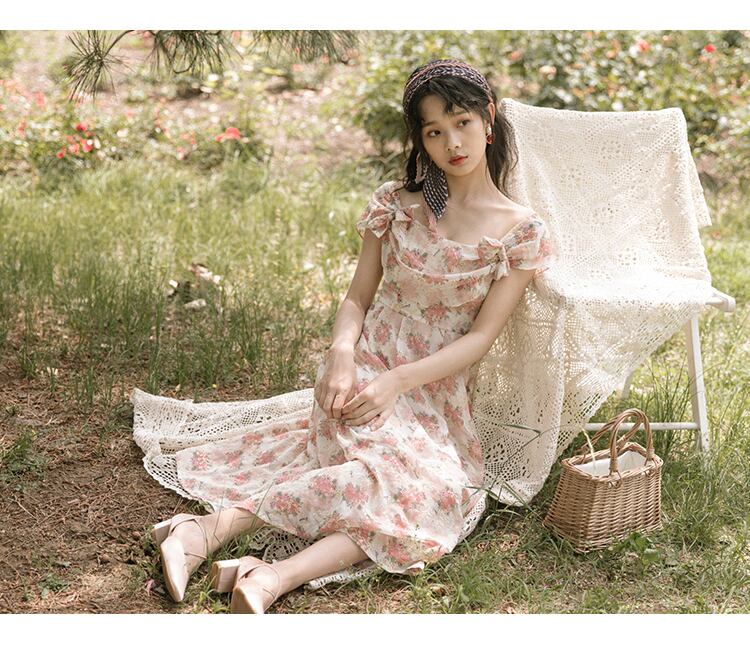 送料無料୨♥୧ サマーレディース妖精ドレス スパゲッティストラップフローラルプリントホローでるロマンチックゴージャスロングシフォン AOS42354116451