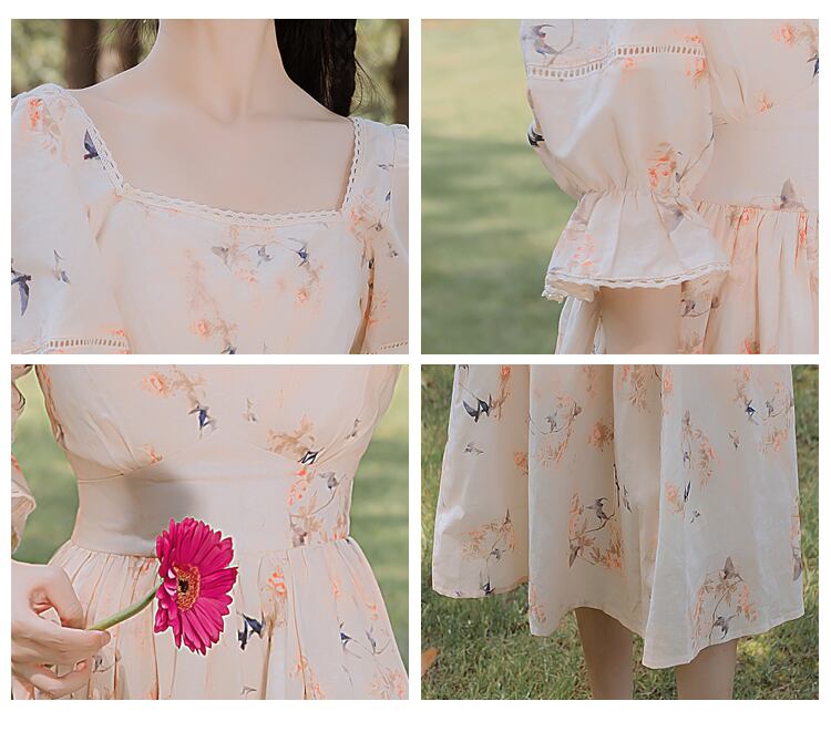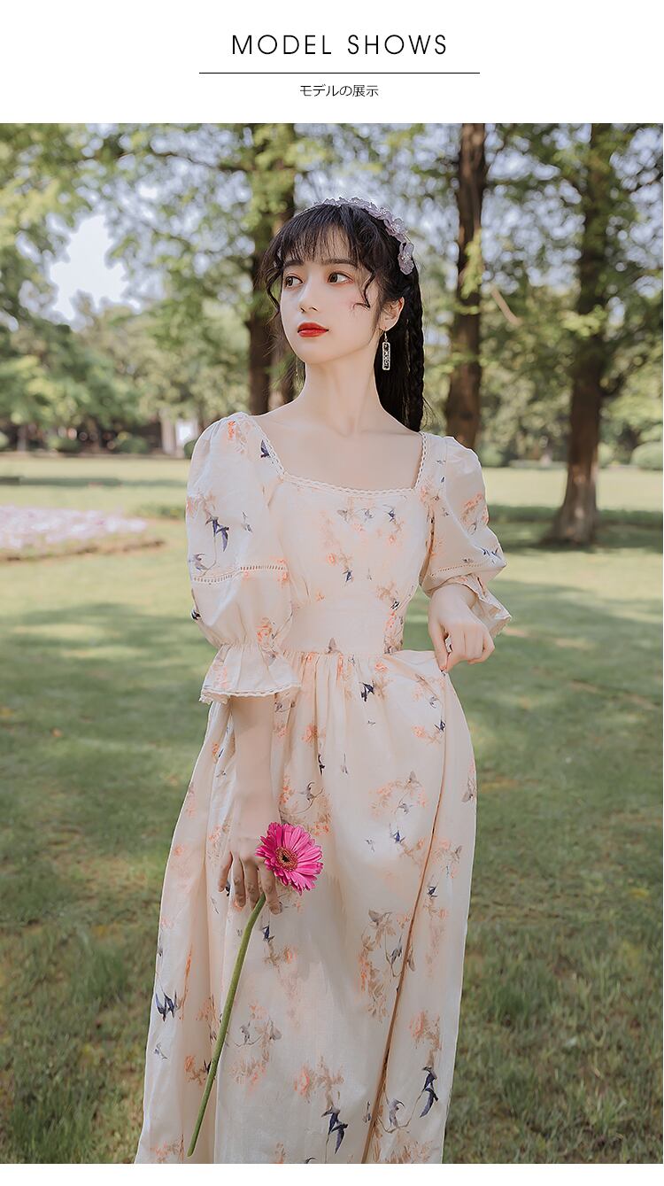送料無料୨♥୧ サマーレディースロマンチックロングドレス 平方カラープリントスリムベスティドスパフスリーブクリカルシックドレス ワンピース AOS94197279810