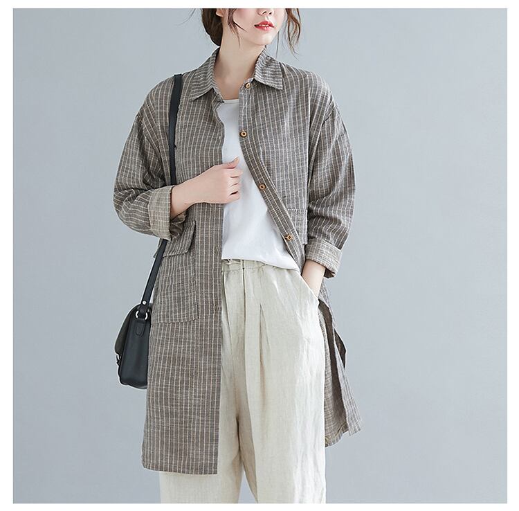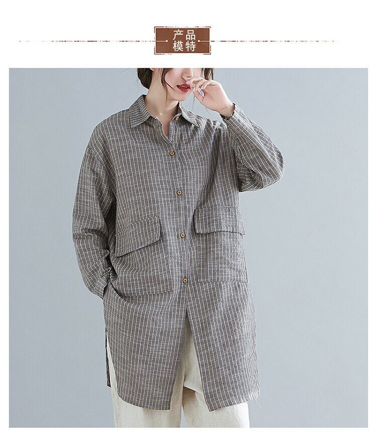 送料無料୨♥୧ プラスサイズスプリングオータムレディースロングブラウス 断るカラーストライプルーズヴィンテージコットンシャツ AOS78087275916