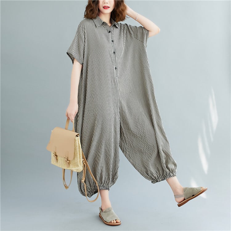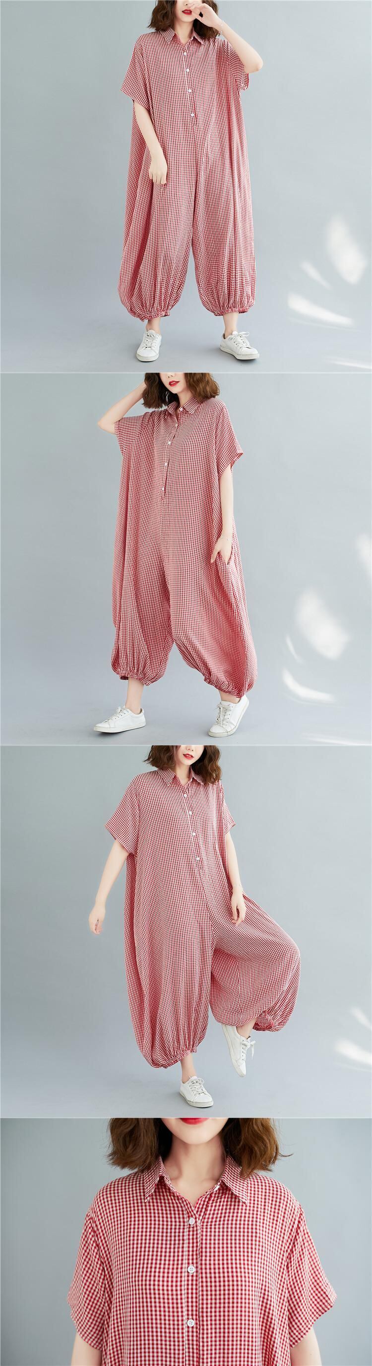 送料無料୨♥୧ プラスサイズレディースサマージャンプスーツ オールインワン プレイスーツ オールインワン ロンパース オールインワン ロングパンツ ズボンルーズコットン格子柄ボタン AOS71268127717
