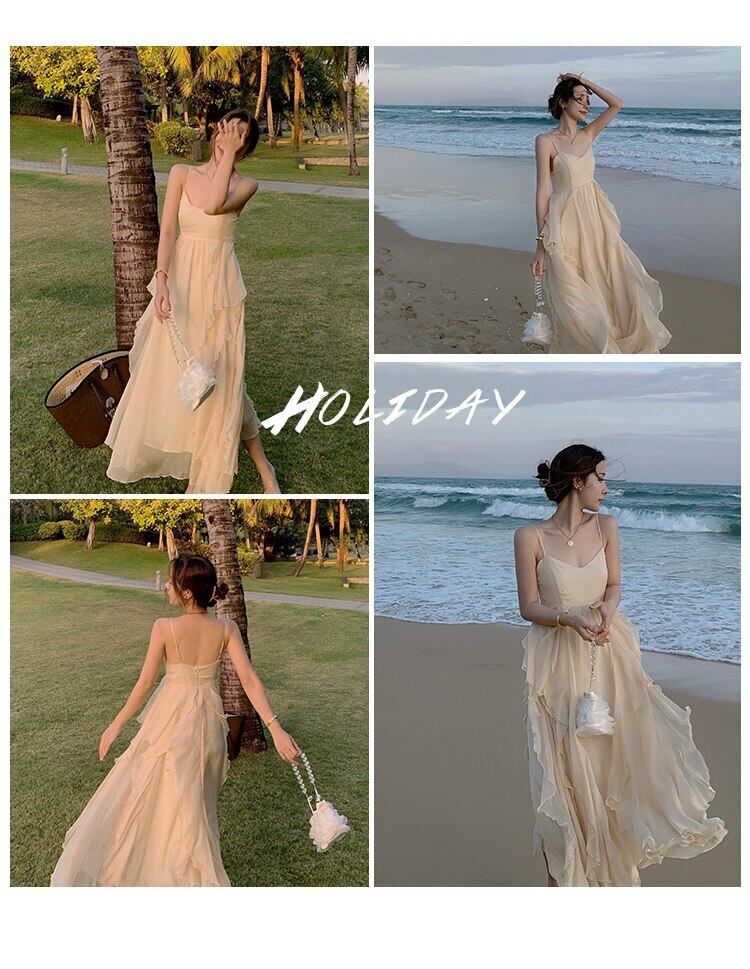 送料無料୨♥୧ 2021サマーレディースノースリーブマキシビーチドレス バックレスVネックカーキフリル旅行ベスティドス AOS42503824911