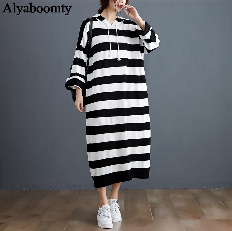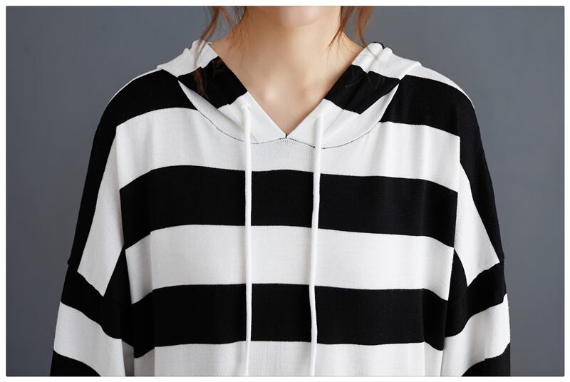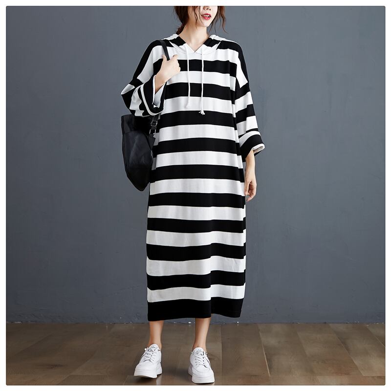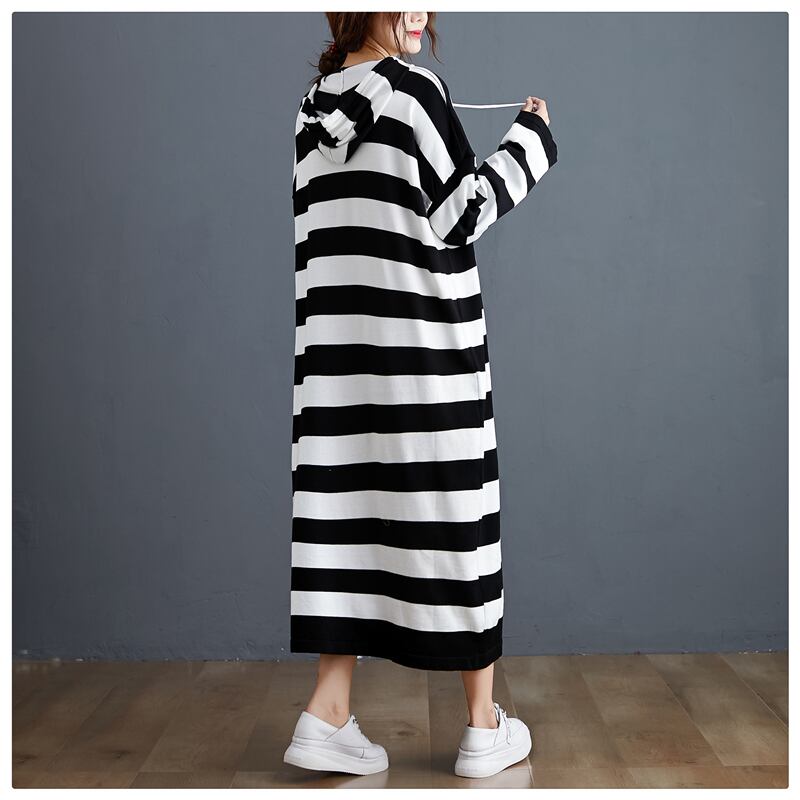 送料無料୨♥୧ スタイルオータムウィンターレディースプラスサイズドレス フードホワイトブラックストライプ特大ルーズニットロングドレス ワンピース AOS22679467279
