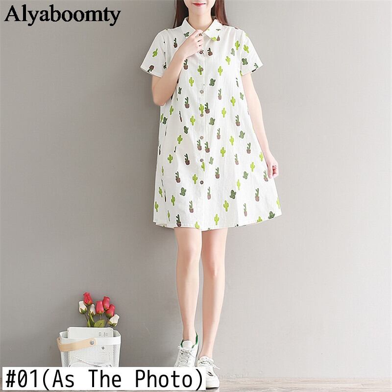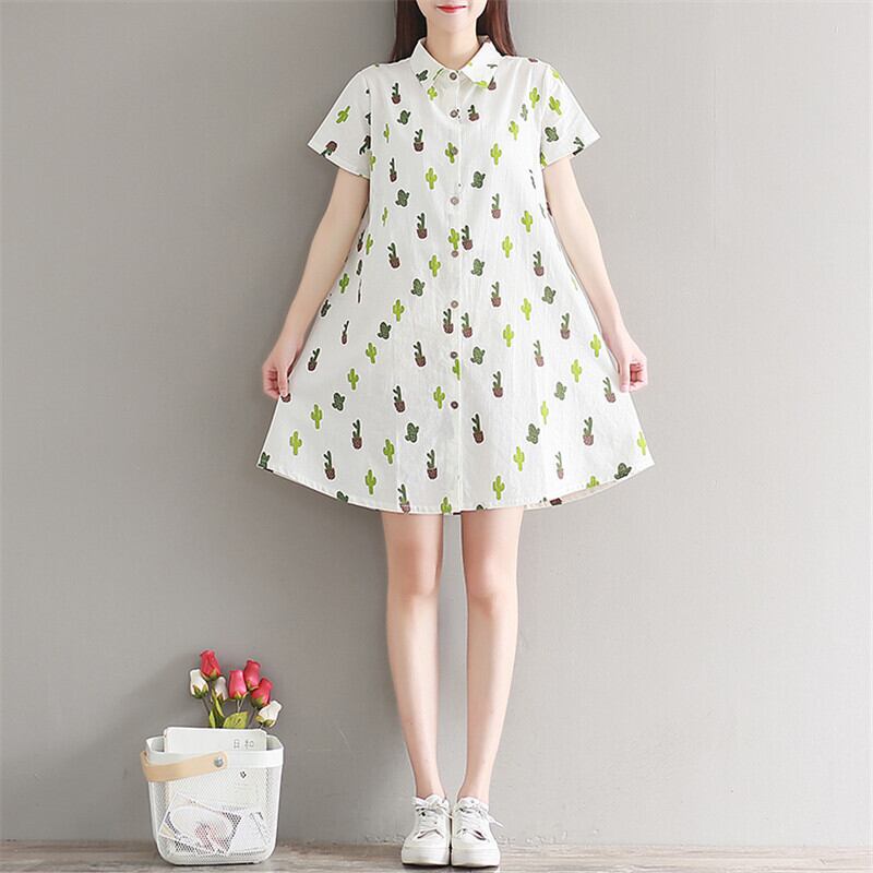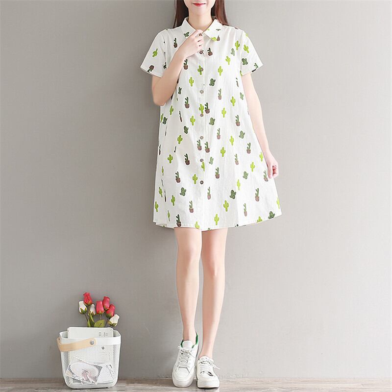 送料無料୨♥୧ 森サマーレディースミニシャツ ドレス 断るカラーカクタスプリントルーズ半袖スリーブ可愛いコットン AOS30403623726