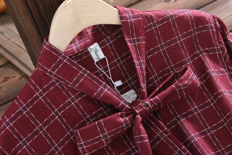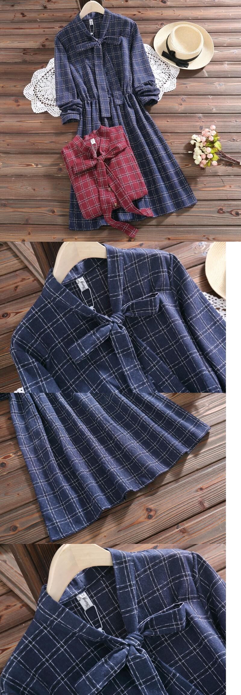 送料無料୨♥୧ ese森オータムスプリングレディースドレス ヴィンテージワインレッドネイビーブルー格子柄ローブ可愛いリボンミニ AOS24711998181