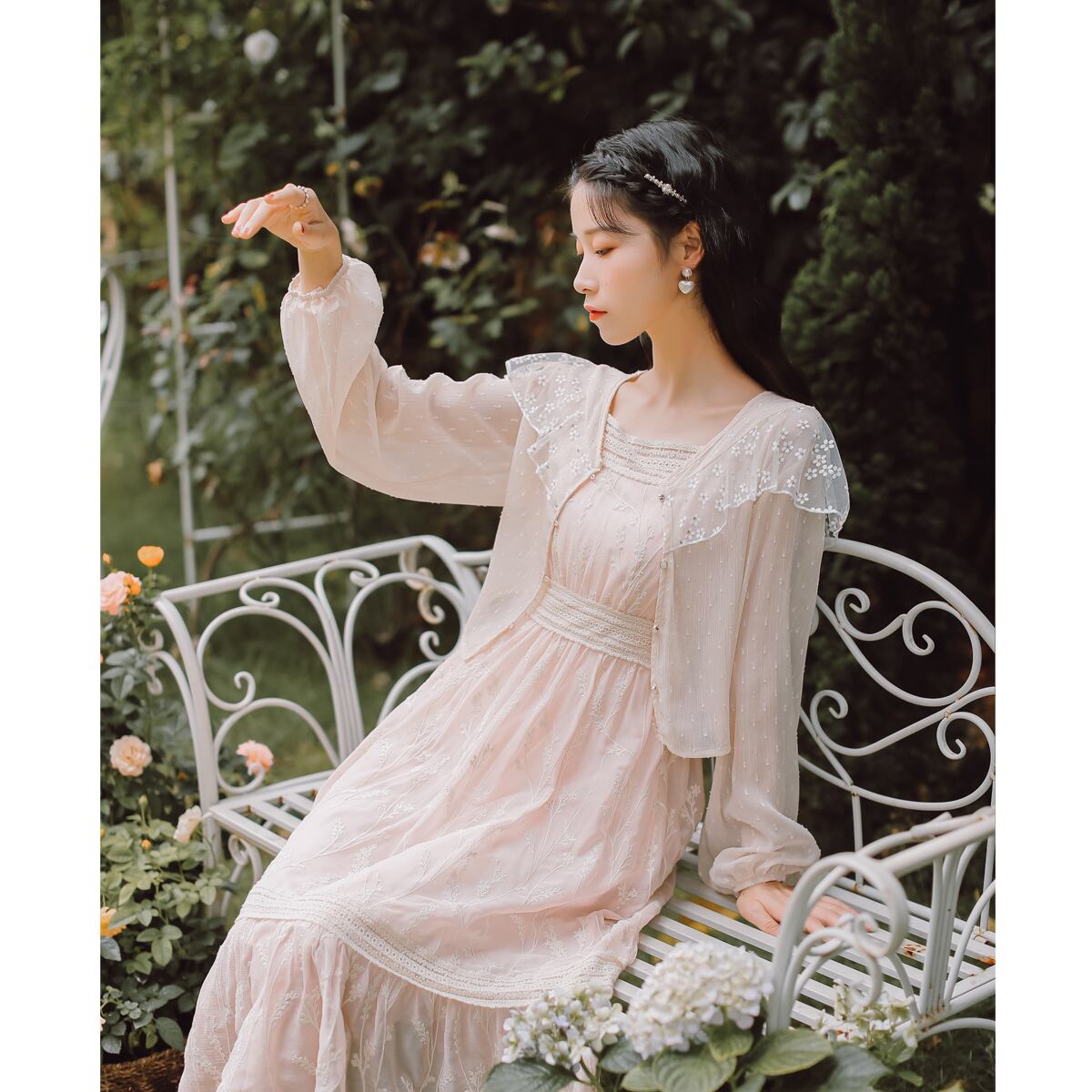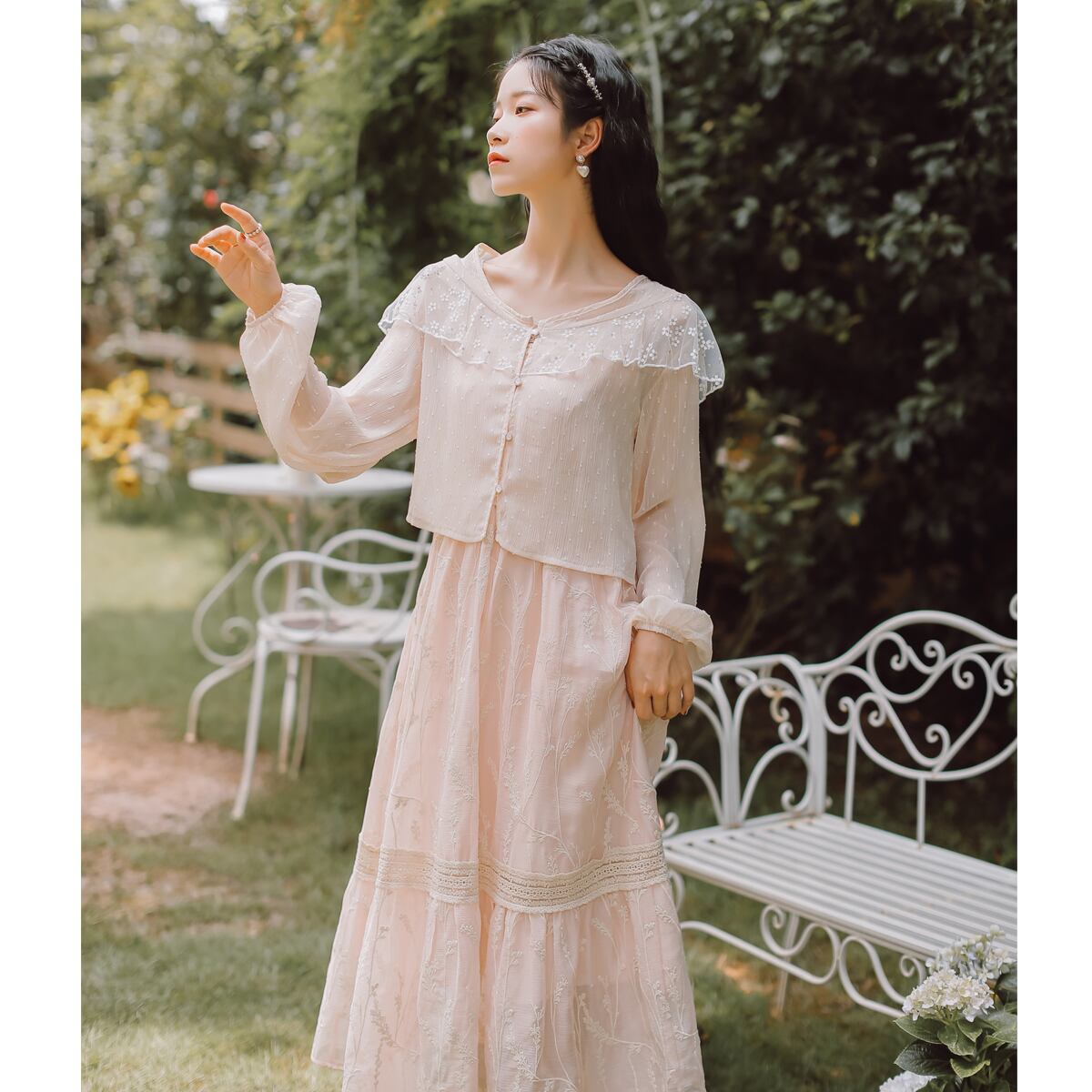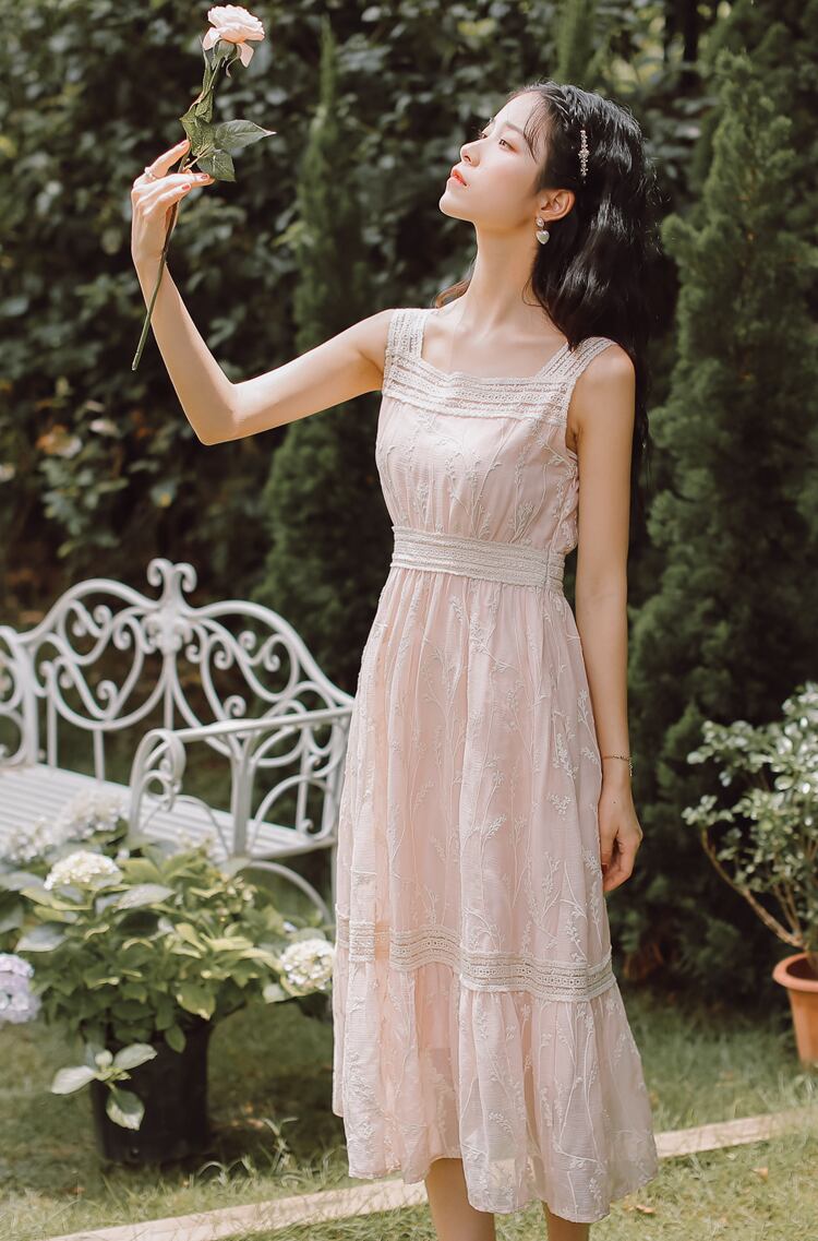 送料無料୨♥୧ レディースロングピンクドレス フランス語ロマンチックフローラル刺繍シフォンノースリーブシックフリルメッシュ AOS59722738516