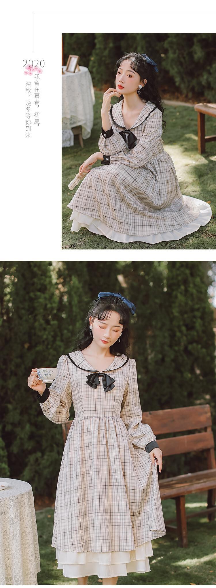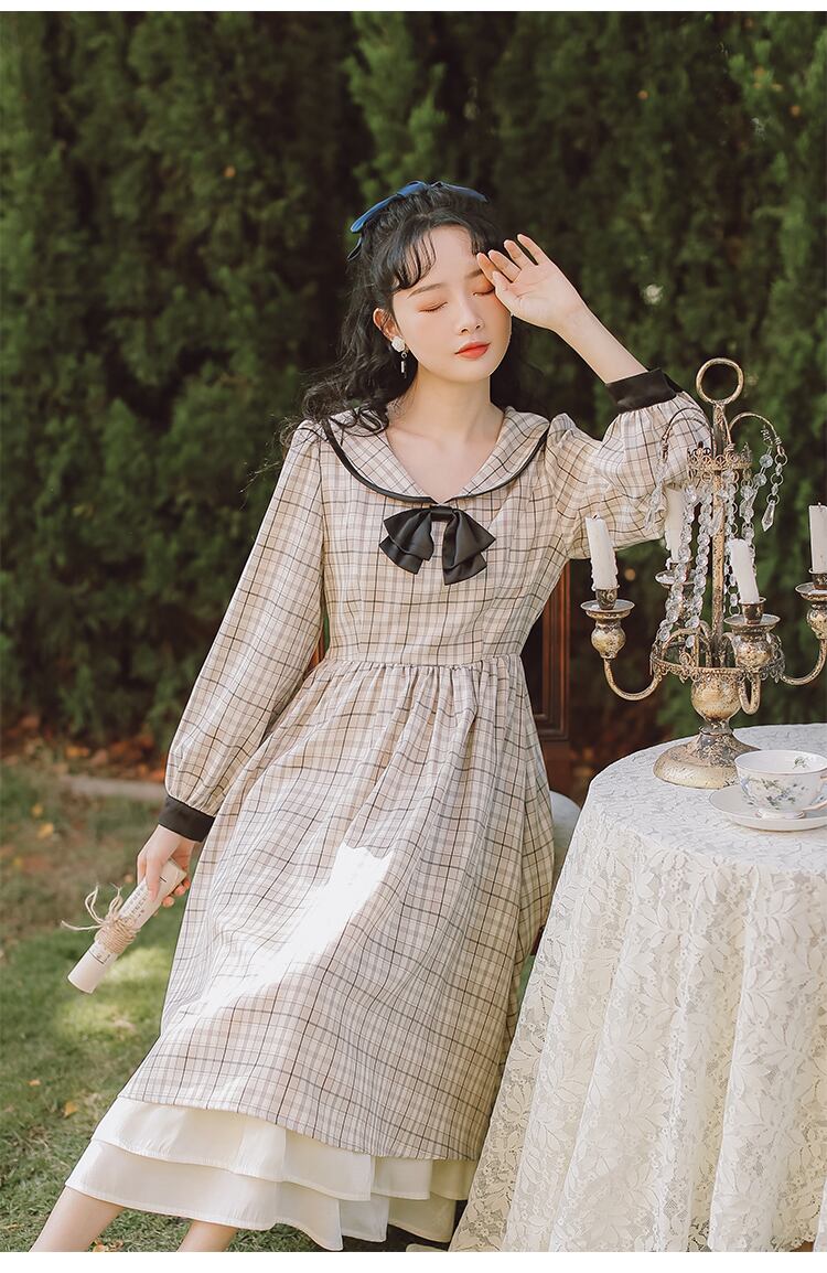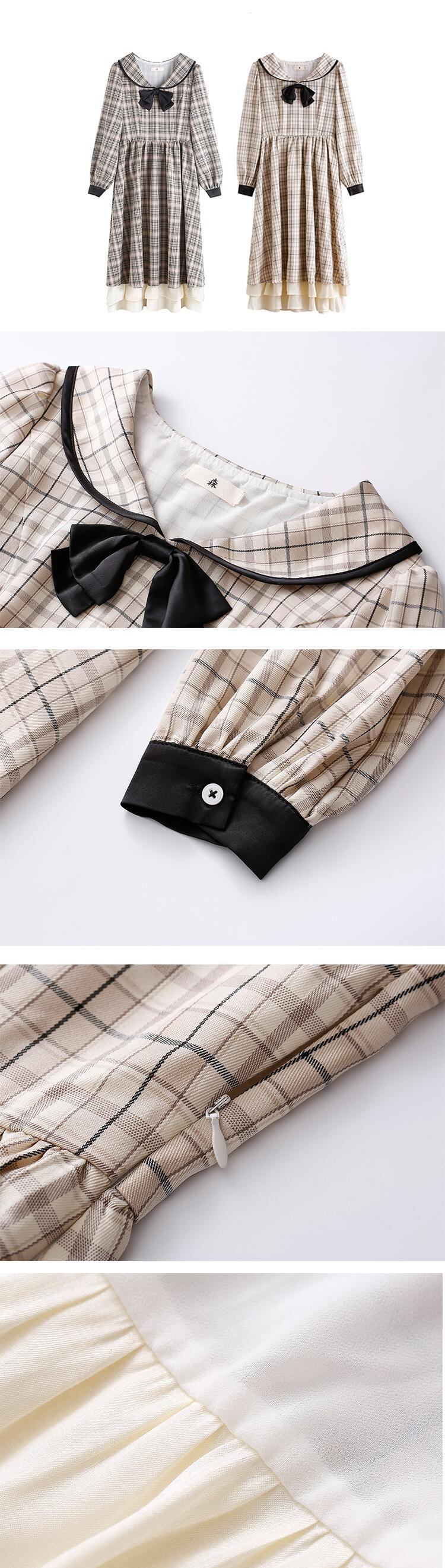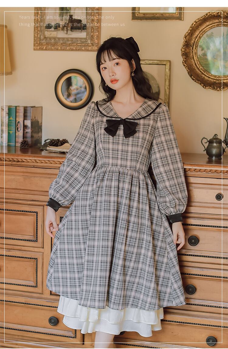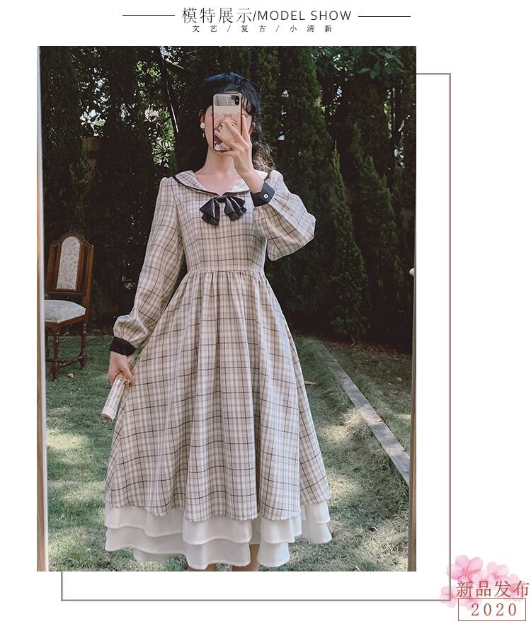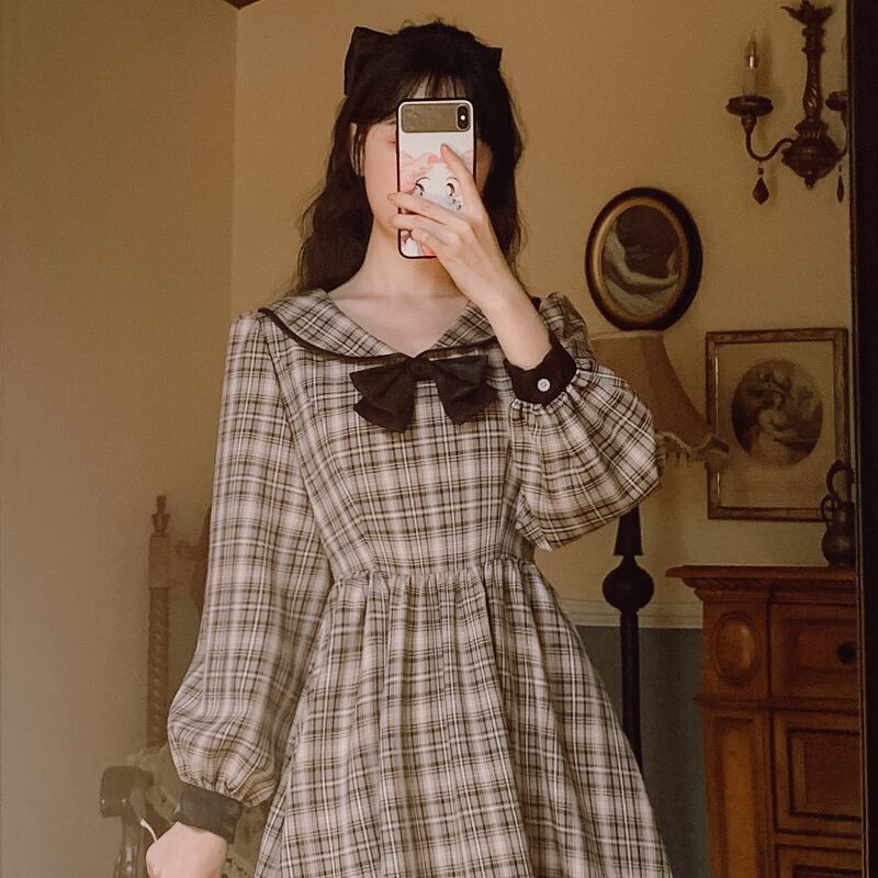 送料無料୨♥୧ イングランドスタイルスプリングオータムレディースミディドレス ピーターパンカラーリボン格子柄ヴィンテージ長袖スリーブフリルAラインドレス ワンピース AOS76374233026