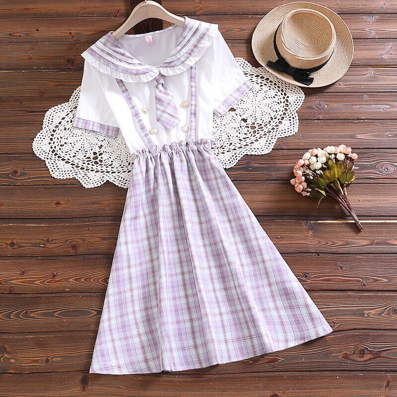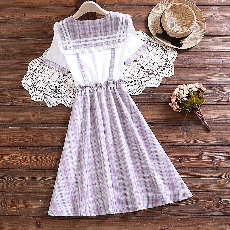 送料無料୨♥୧ eseプレッピースタイルサマーレディースドレス 船乗りカラーブルー紫の格子柄パッチワーク可愛いとネクタイ AOS7208087259