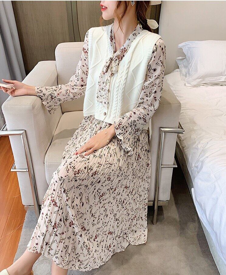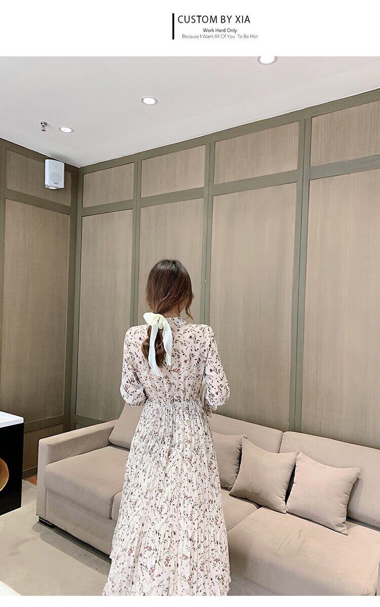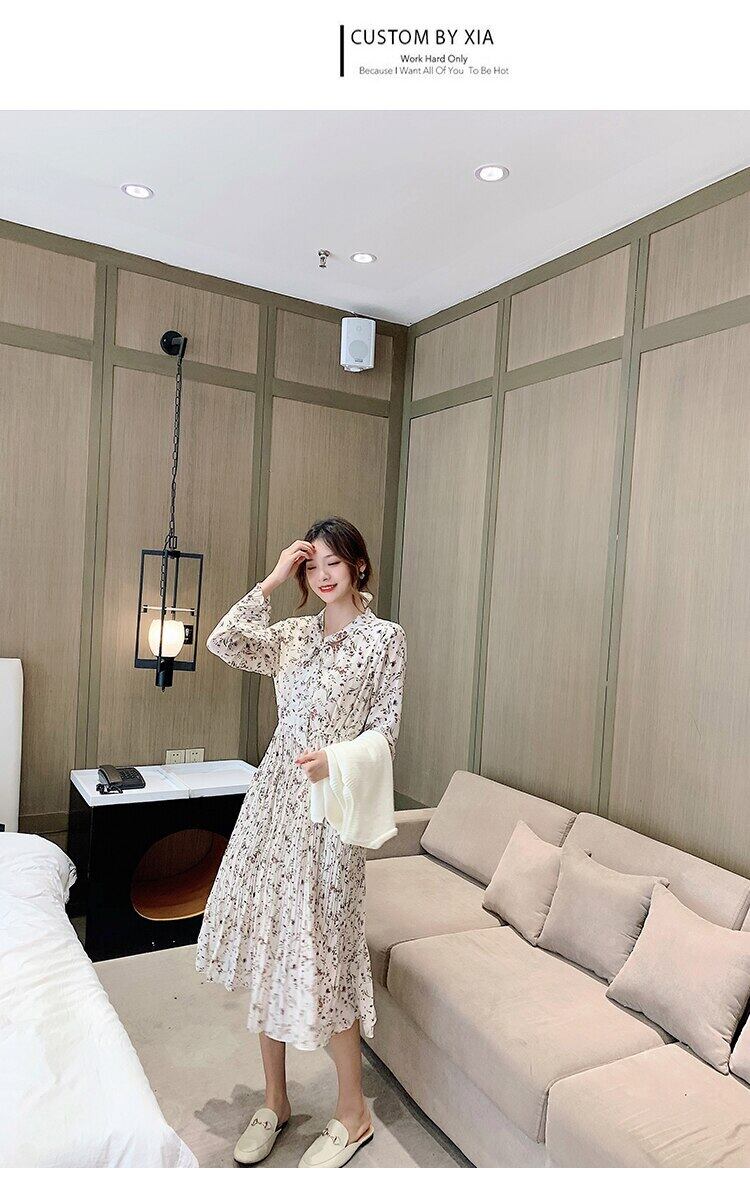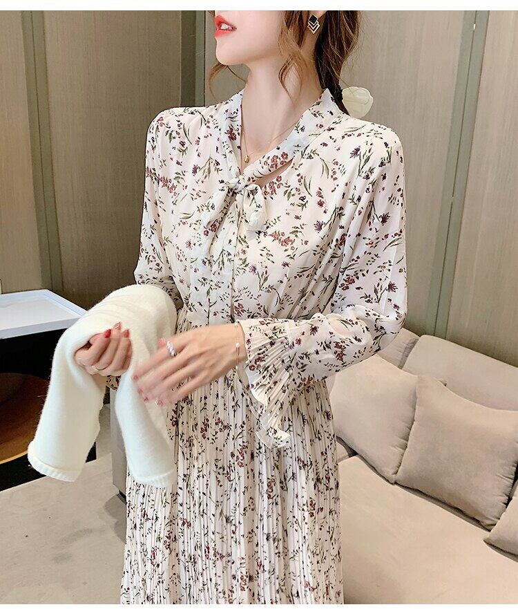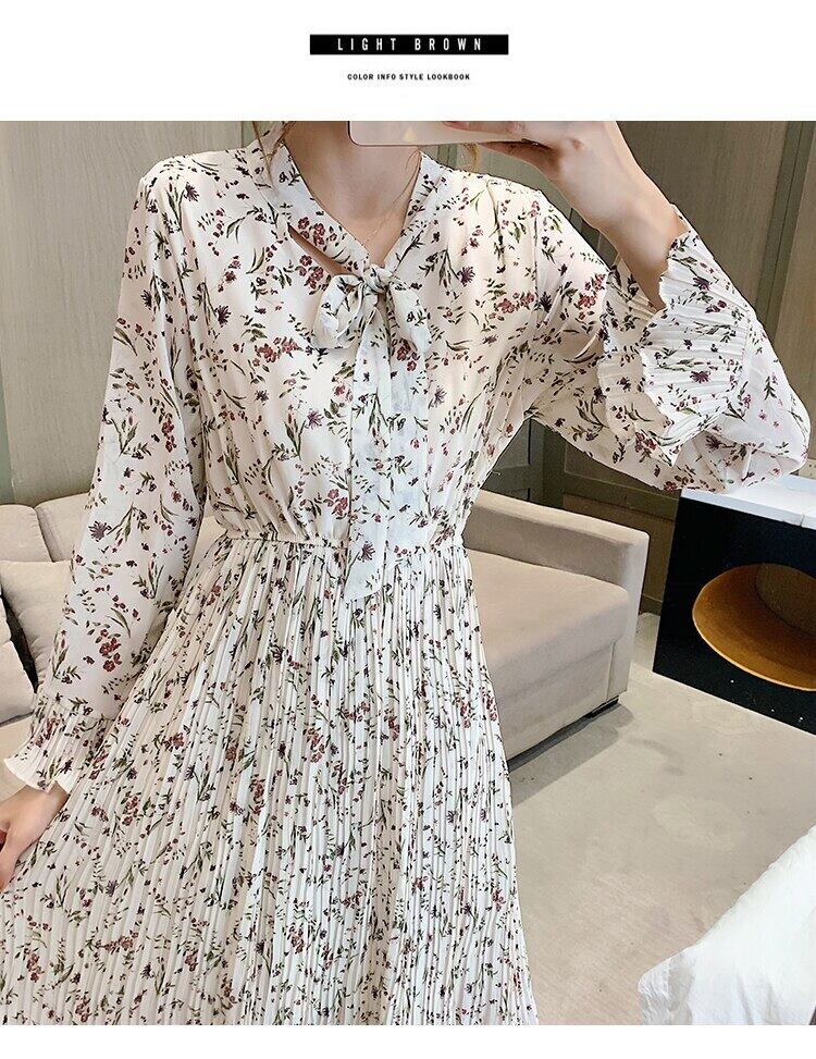 送料無料୨♥୧ 2021スプリングオータムシックレディースロングドレス リボンカラーフローラルプリント甘い長袖スリーブシフォンプリーツ AOS21591059045