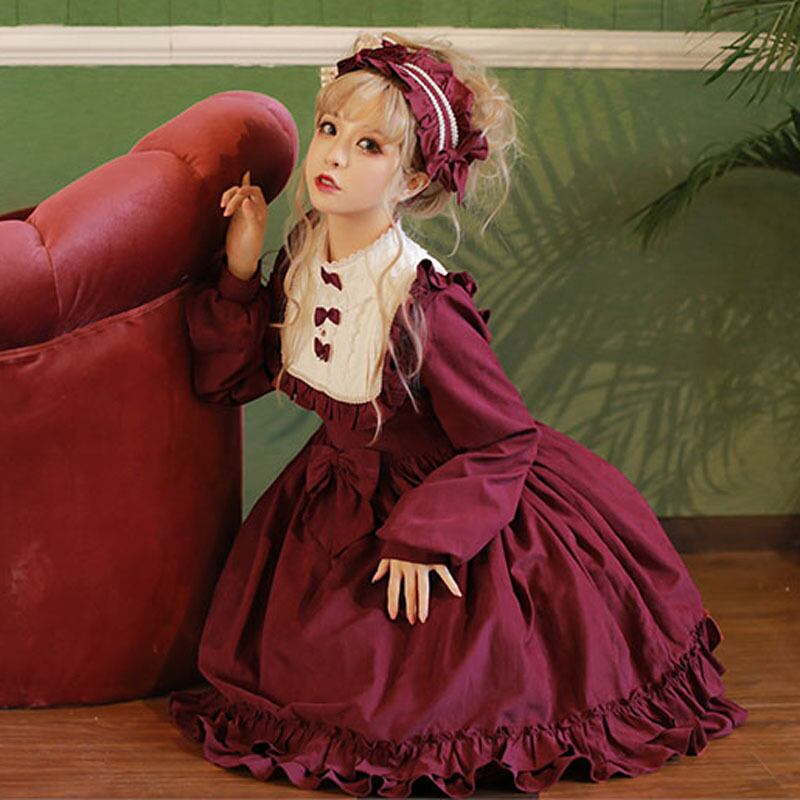 送料無料୨♥୧ eseロリータスタイルレディースパーティードレス カラーリボンワインレッド愛らしいウィントフリル可愛い AOS85523796139