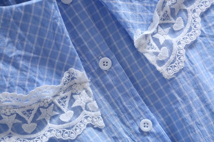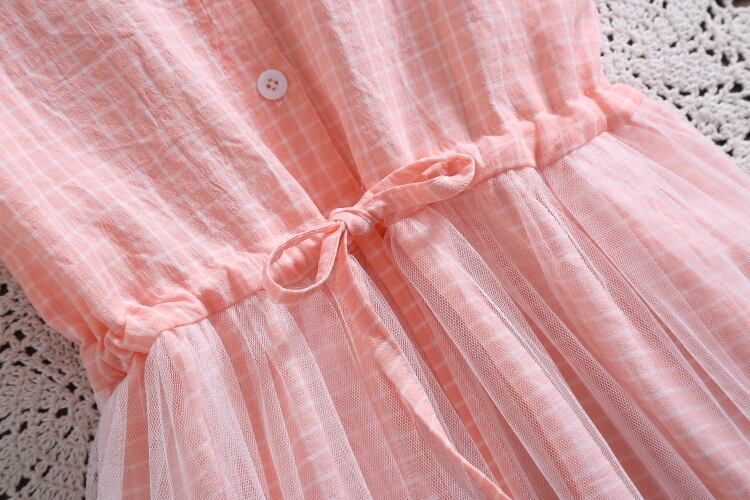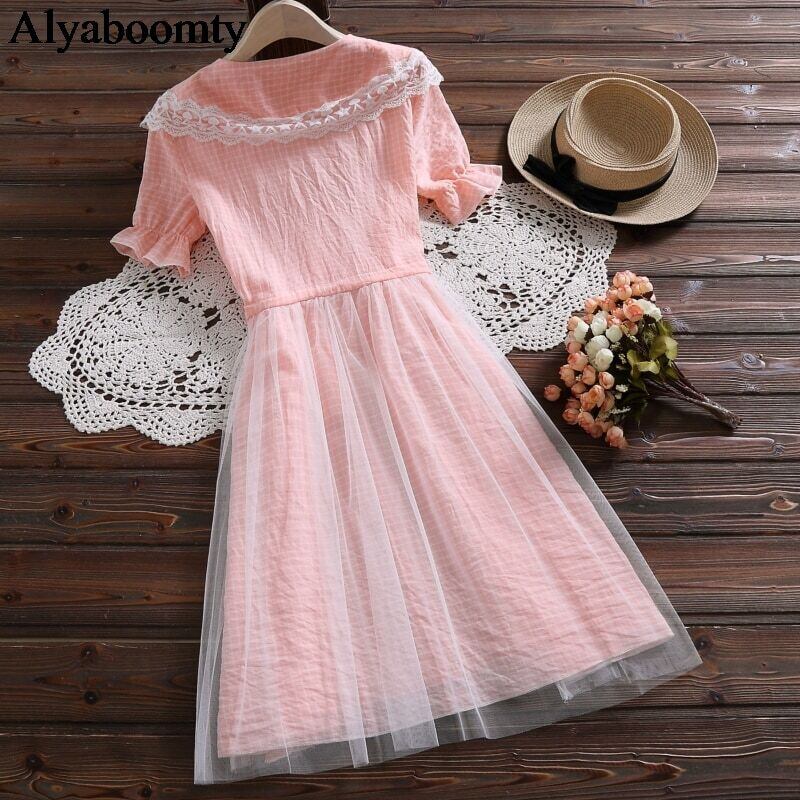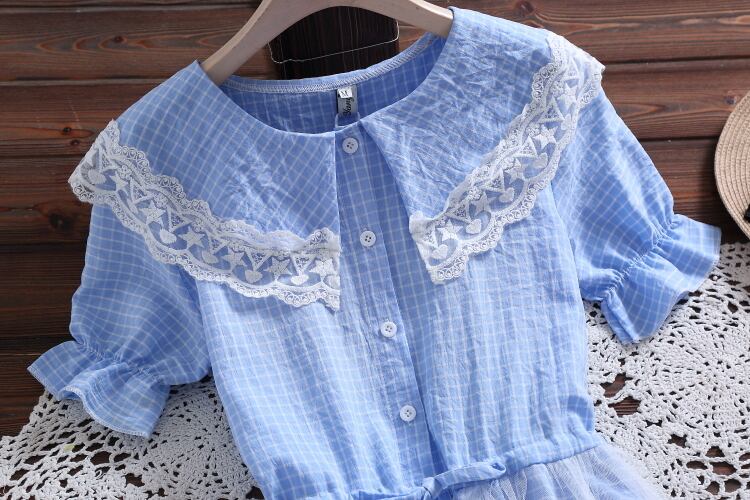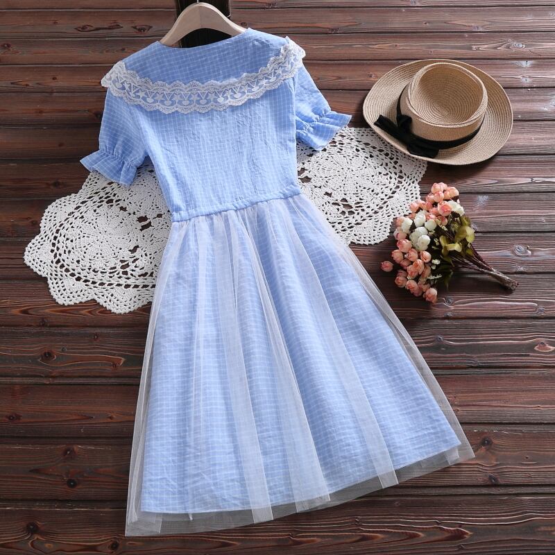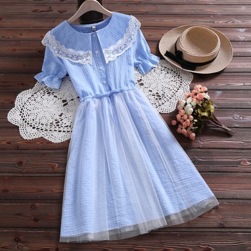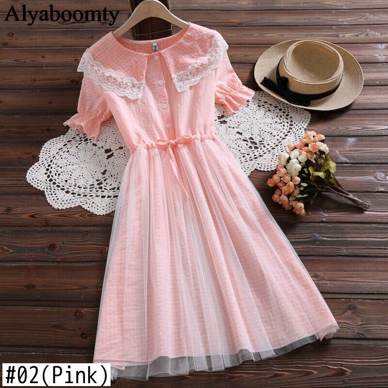 送料無料୨♥୧ 2021サマープレッピースタイルレディースソリッド ドレス ピーターパンカラーとレースピンクブルー格子柄半袖スリーブ可愛いチュール AOS50653131728