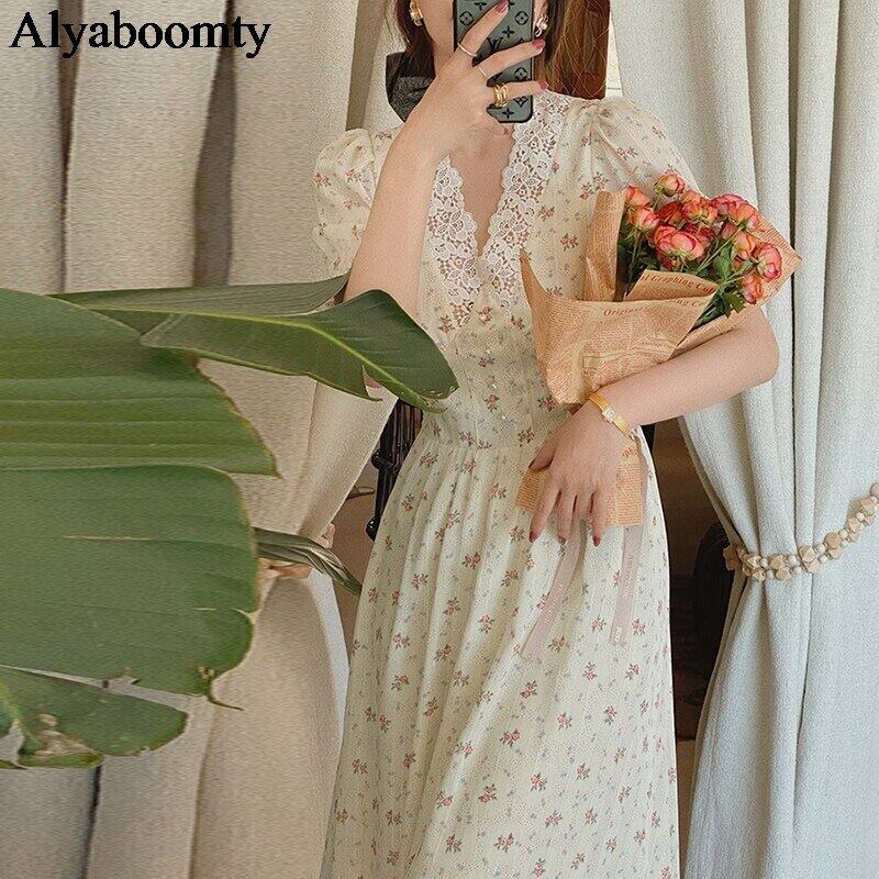 送料無料୨♥୧ シックサマーレディースロングドレス レースVネックベージュブルーフローラルプリントvestidoパフスリーブロマンチックミディドレス ワンピース AOS23032228337