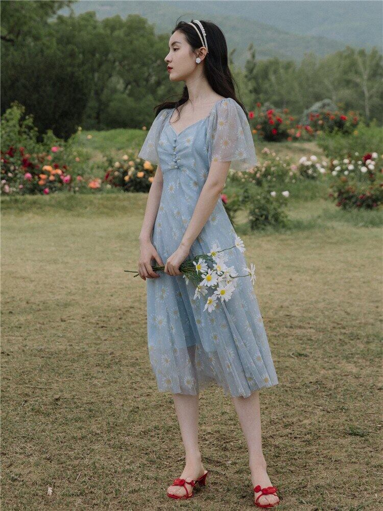 送料無料୨♥୧ 2021サマーレディースフランス語ロマンチック妖精メッシュドレス 平方カラーフローラルプリントブルーパーティー AOS51687537343