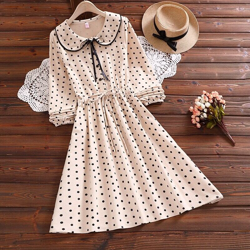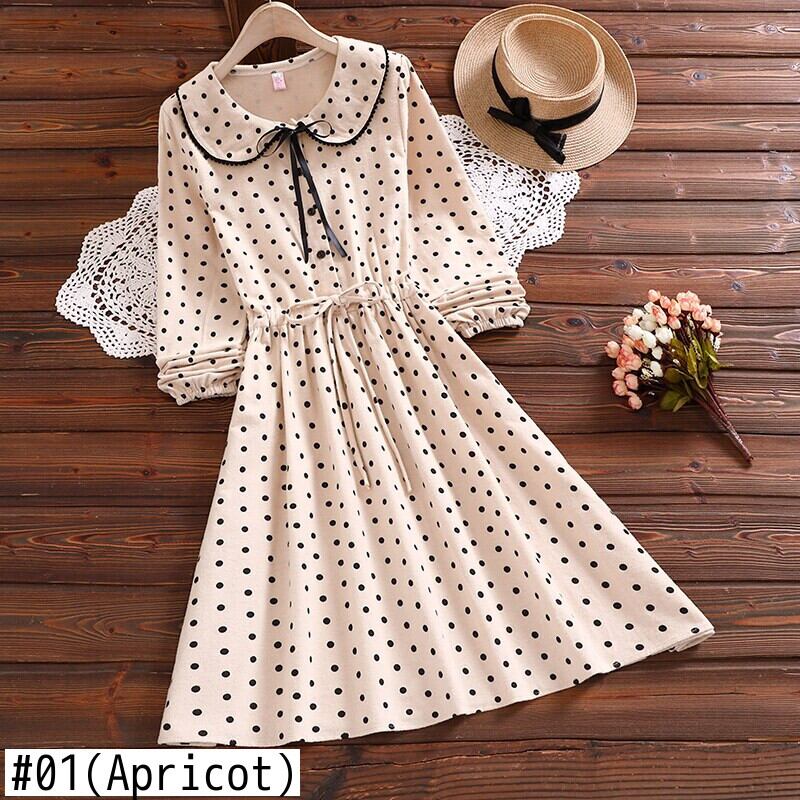 送料無料୨♥୧ eseプレッピースタイル可愛いレディースドレス ピーターパンカラーイエローアプリコットレースアップリボン長袖スリーブ水玉ドレス ワンピース AOS84853450726