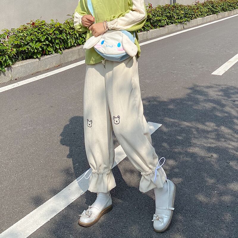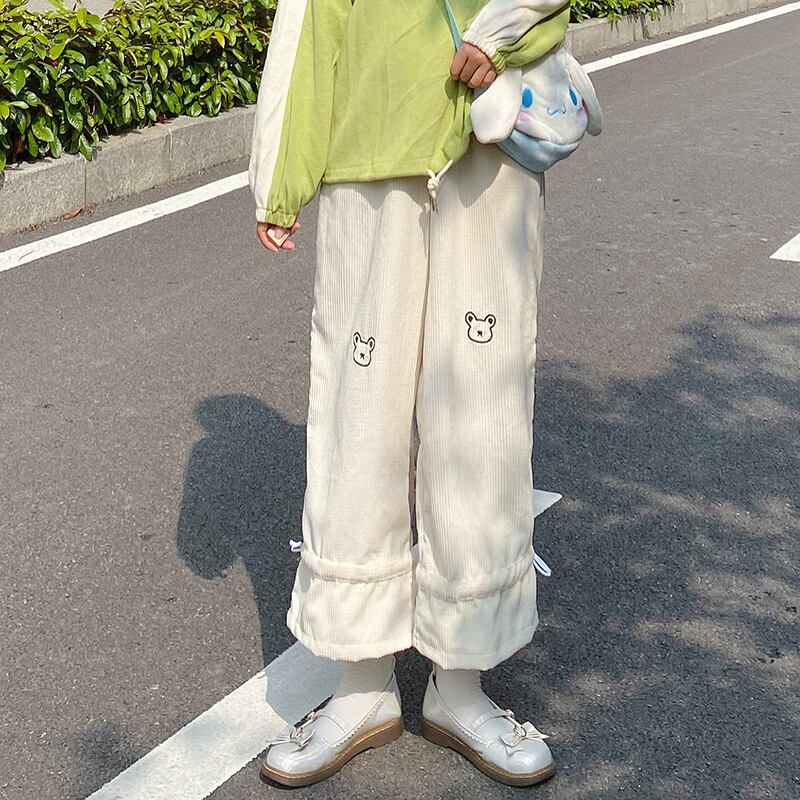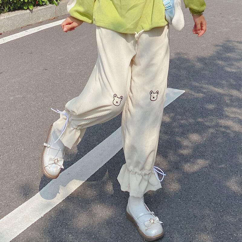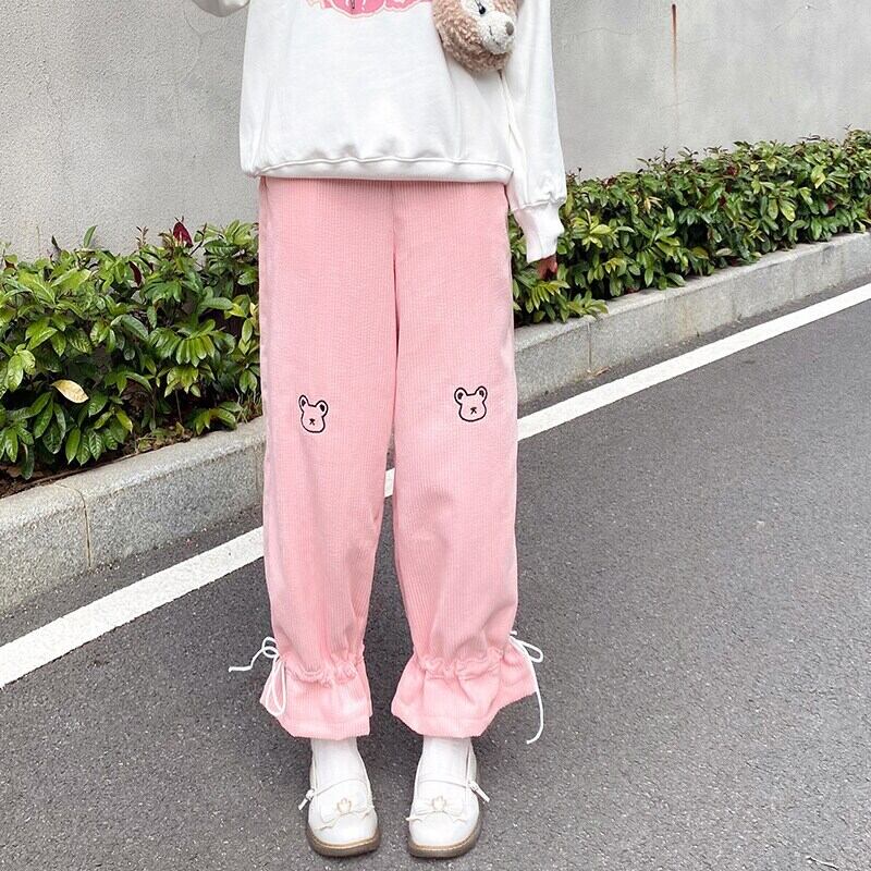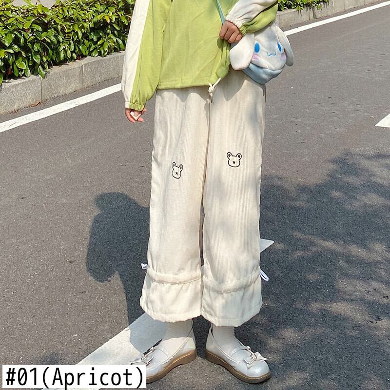 送料無料୨♥୧ eseスプリングオータムレディースロリータパンツ ウェストアプリコットピンクワイドレッグズボン可愛い刺繍くまコーデュロイ AOS95089386867