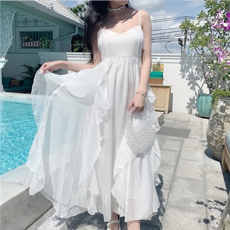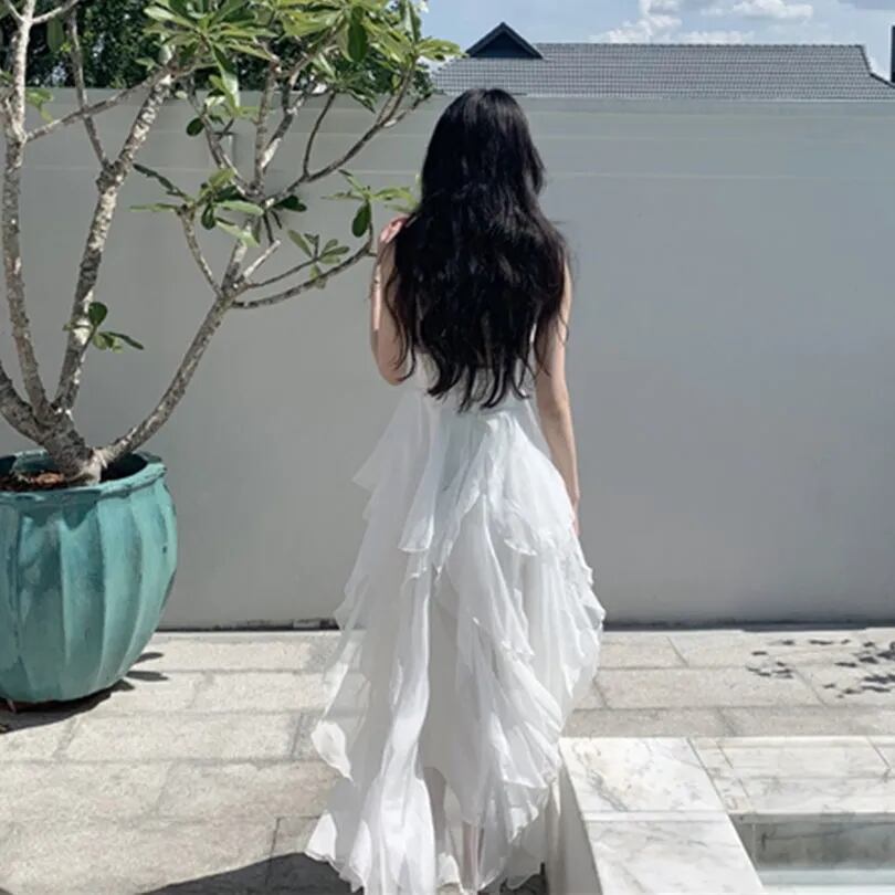 送料無料୨♥୧ 2021サマーレディースホワイトマキシドレス Vネックフリル休日ビーチ妖精ロングノースリーブ AOS85894407461