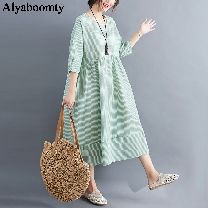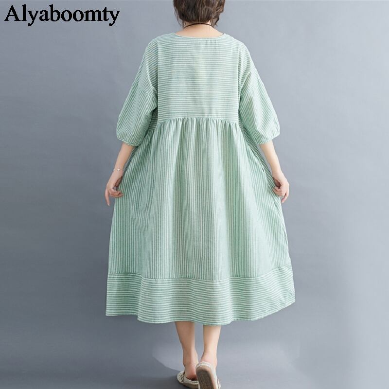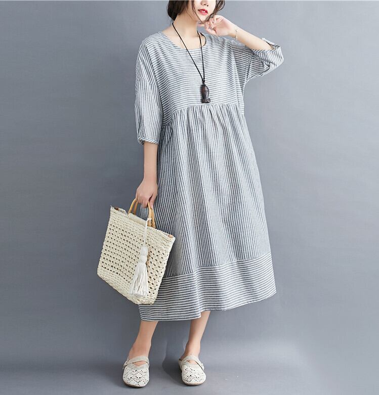 送料無料୨♥୧ プラスサイズサマーレディースoロングドレス ワンピース 首グレーグリーンストライプ特大バギーランタンスリーブヴィンテージコットン服 AOS38092424515
