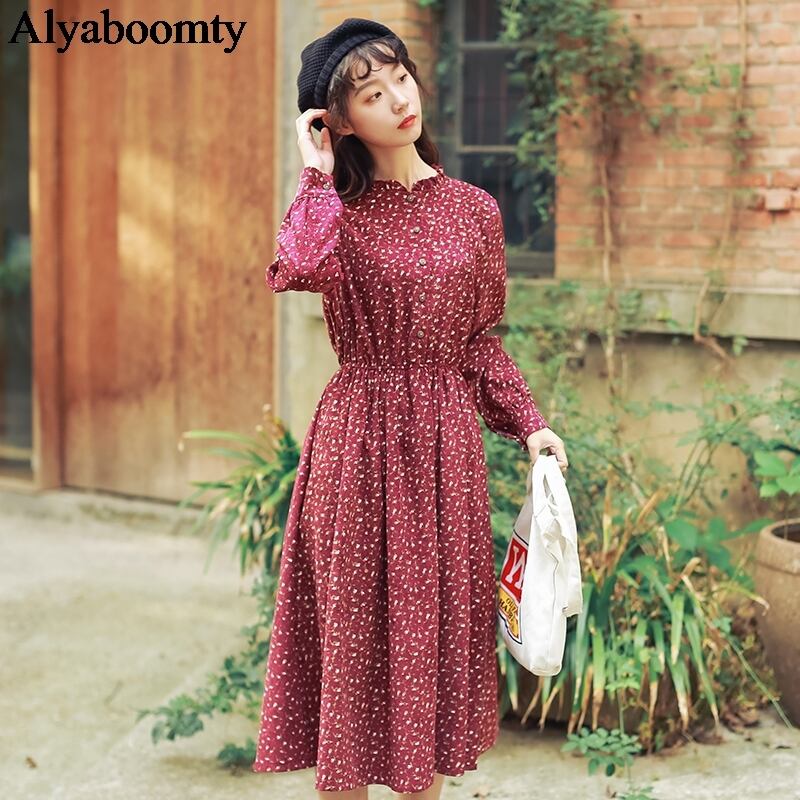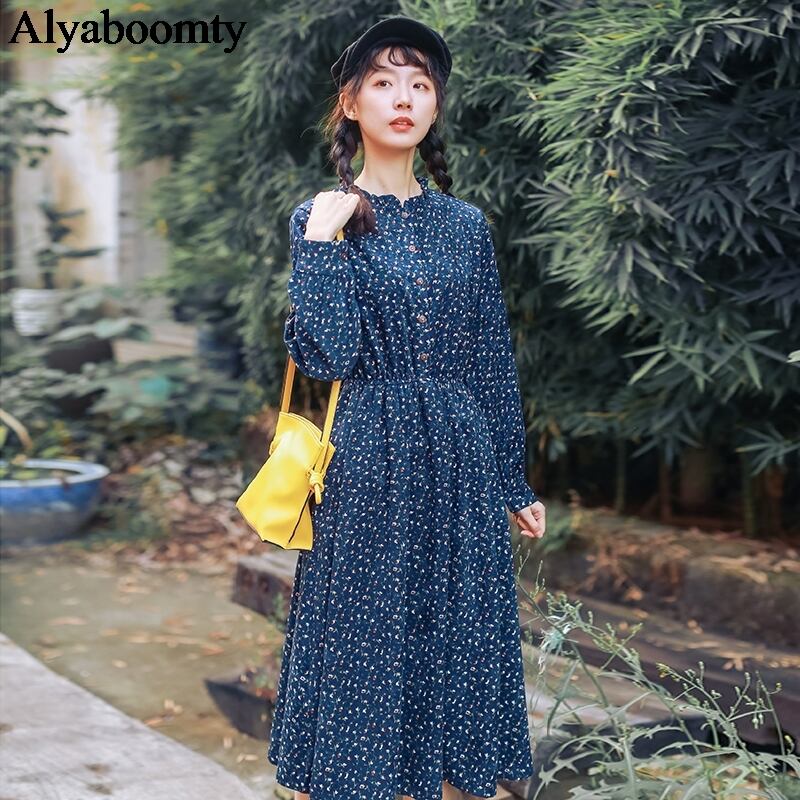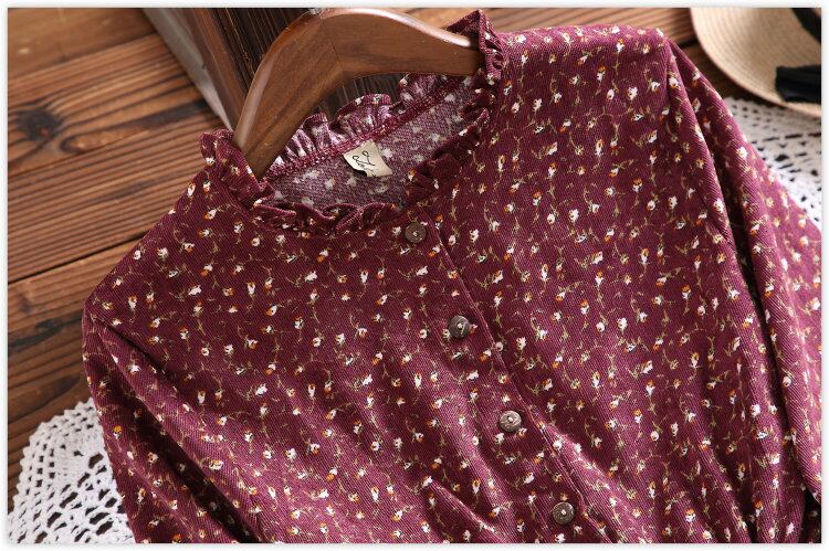 送料無料୨♥୧ 森オータムスプリングレディースミディドレス カラーフローラルプリント柄ベスティドス長袖スリーブネイビーブルーワインレッドコーデュロイシック AOS66695564881