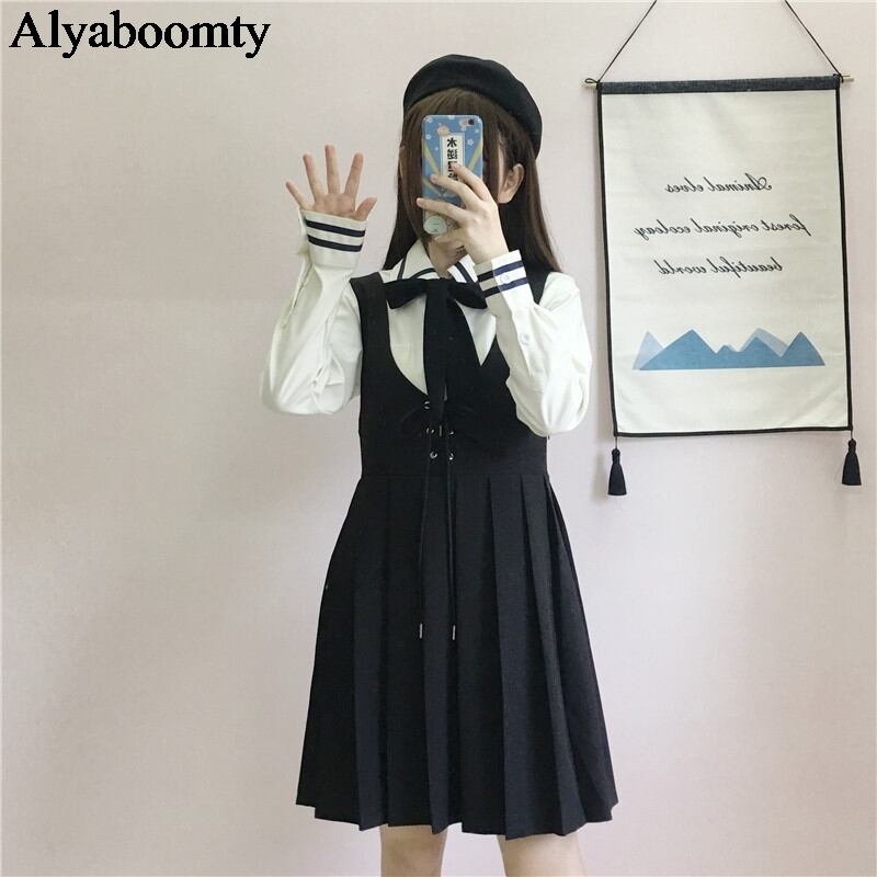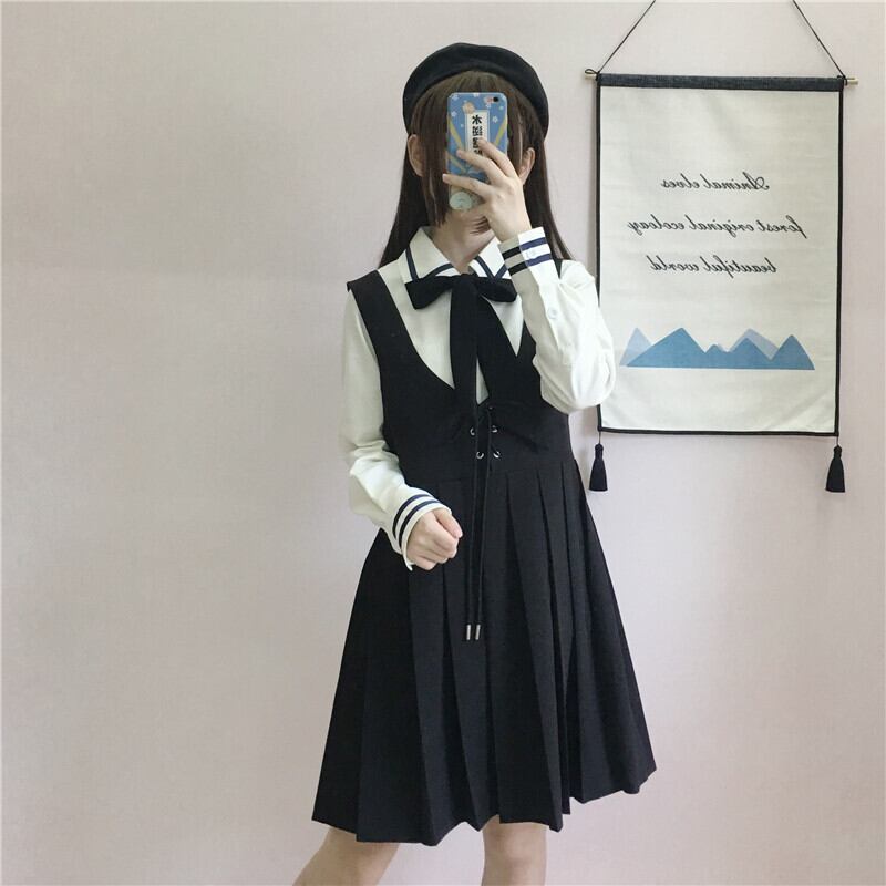 送料無料୨♥୧ eseプレッピースタイルオータムレディースプリーツドレス 原宿ブラックバンドミニjkノースリーブ可愛い AOS86339777452