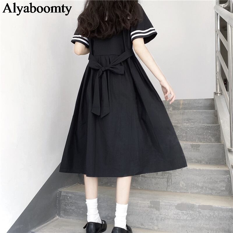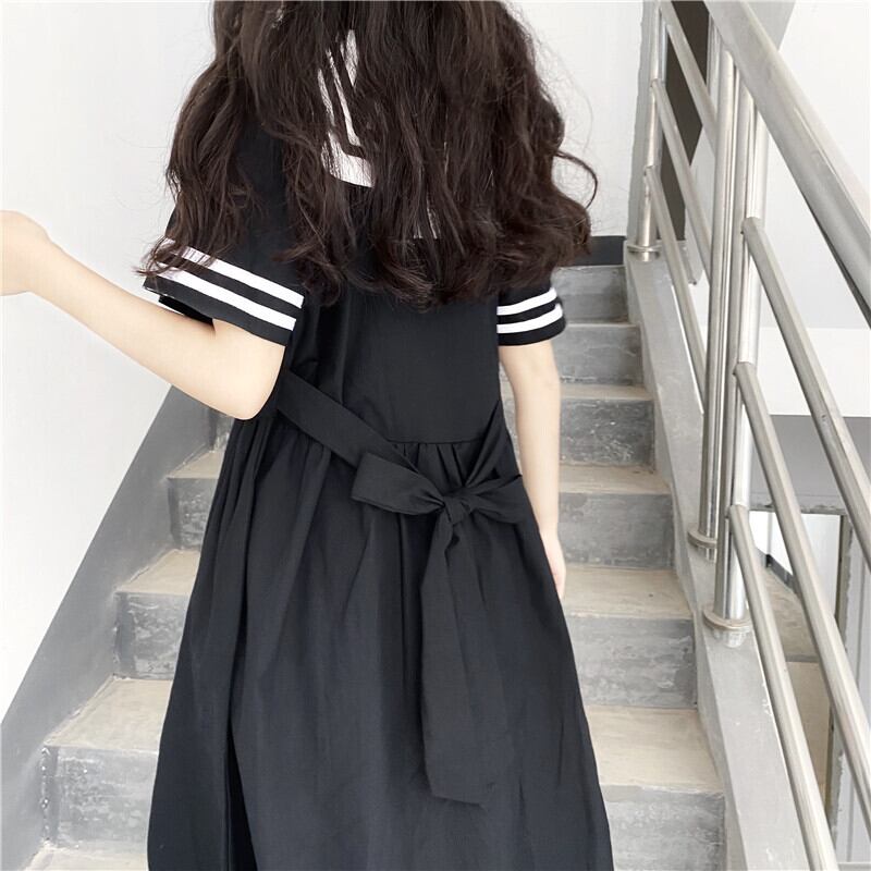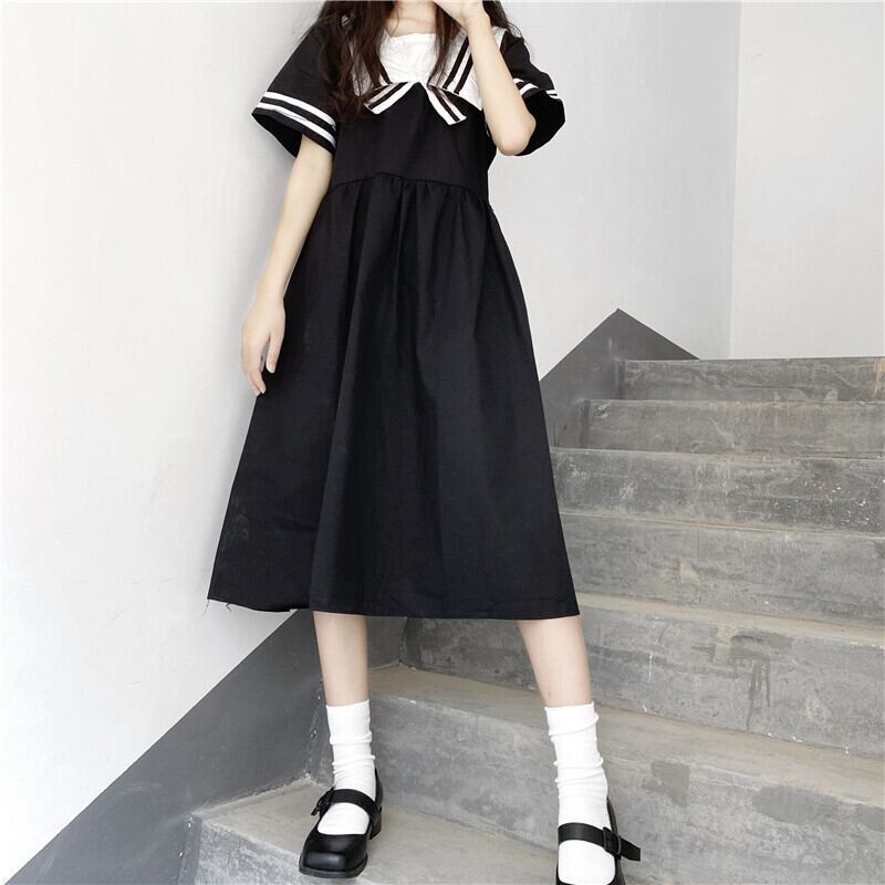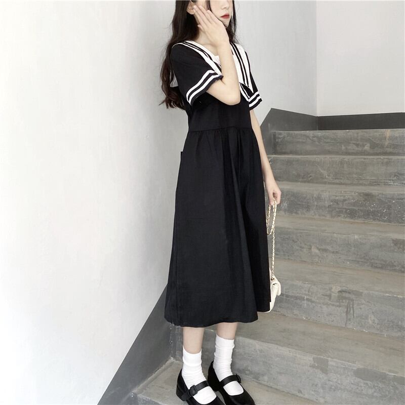 送料無料୨♥୧ eseプレッピースタイルサマーレディースドレス 原宿船乗りカラーブラックルーズフェミニーズベスティドス半袖スリーブコットン AOS70014948270