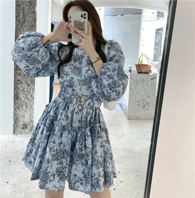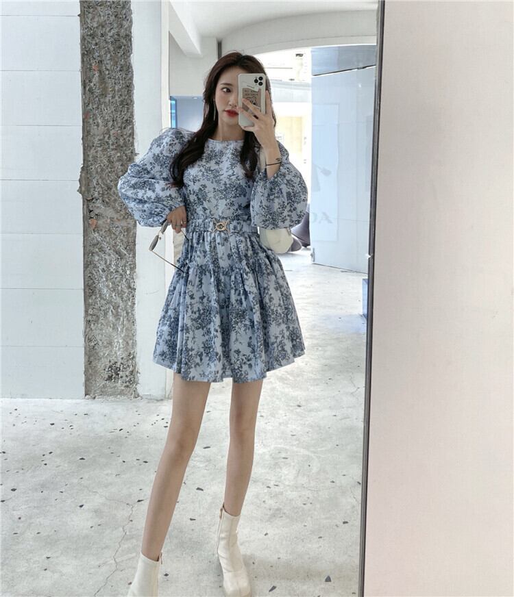 送料無料୨♥୧ 2021シックスプリング秋レディースoミニドレス 首ブルーフローラルプリントvestidoランタンスリーブとベルト AOS75700483142