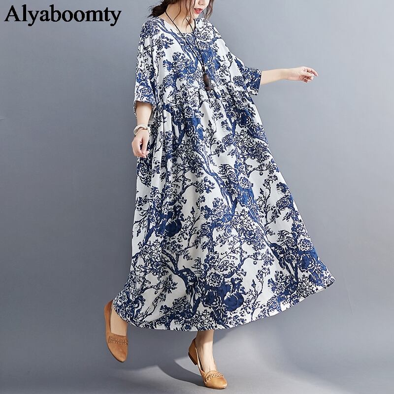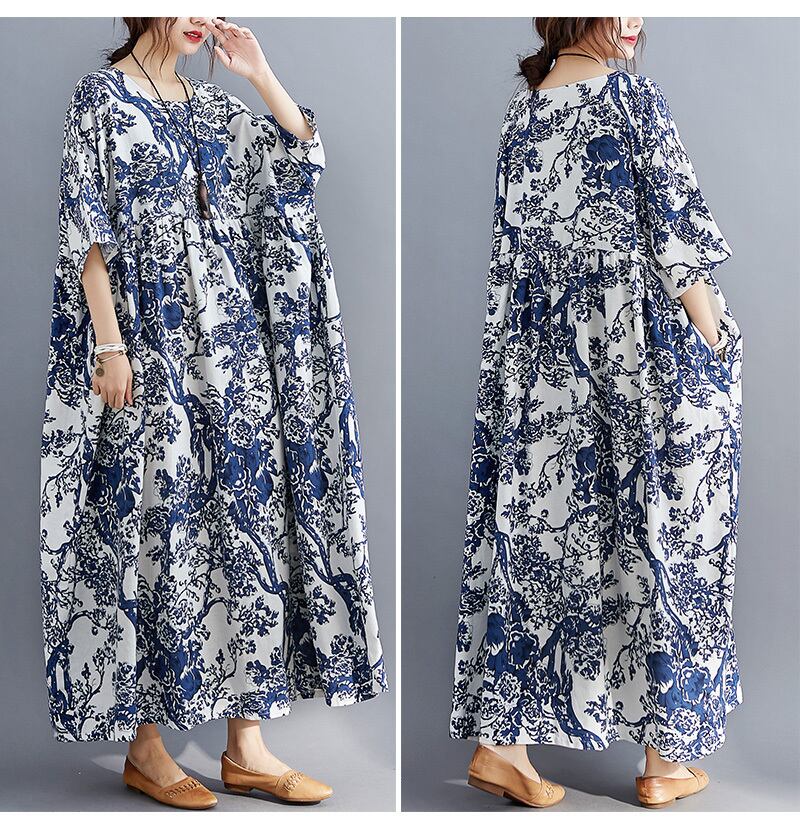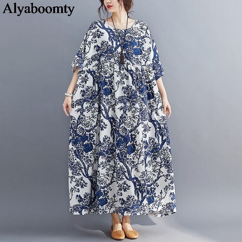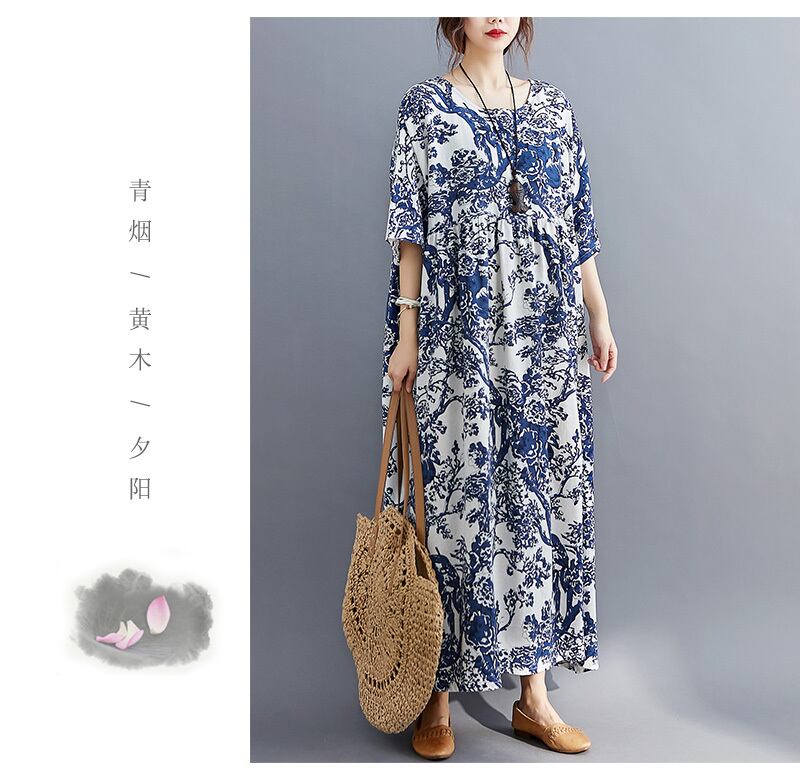 送料無料୨♥୧ 2021プラスサイズサマーレディースoマキシロングドレス 首ヴィンテージプリント特大ルーズガウンコットンバギーと AOS73717206957