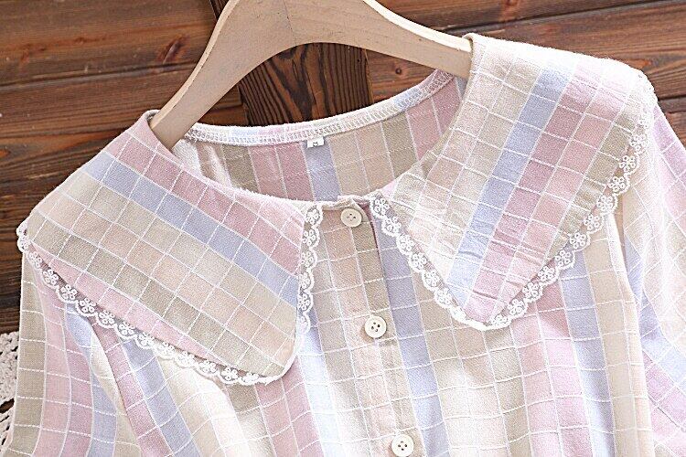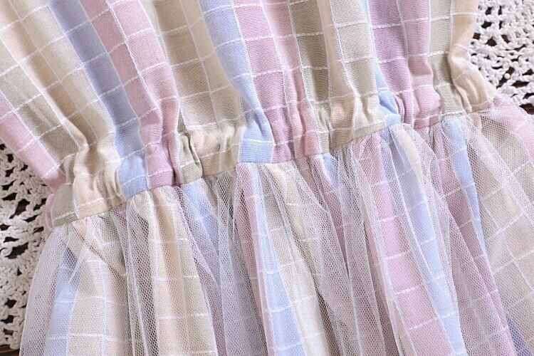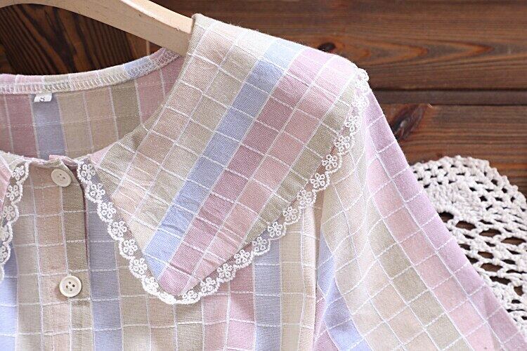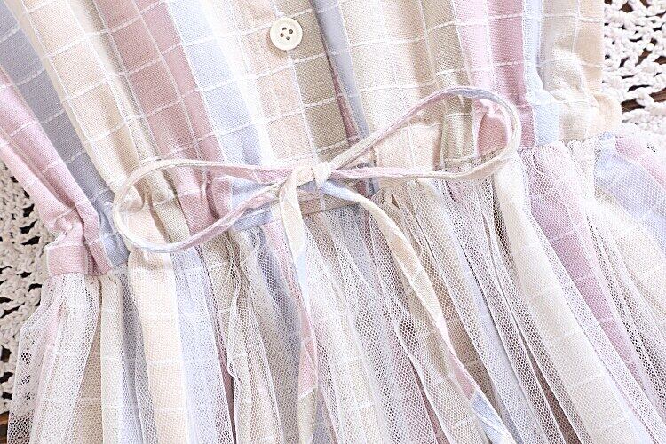 送料無料୨♥୧ 2021プレッピースタイルサマーレディースコットンドレス ピーターパンカラーパステル格子柄レースアップ半袖スリーブチュール AOS28211279180