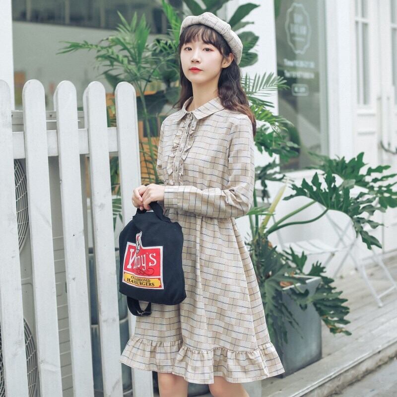 送料無料୨♥୧ ese森オータムスプリングレディースドレス コントラストカラー格子柄ヴィンテージコットン可愛いフリルルーズドレス ワンピース AOS15598067999