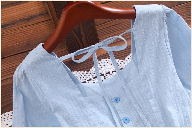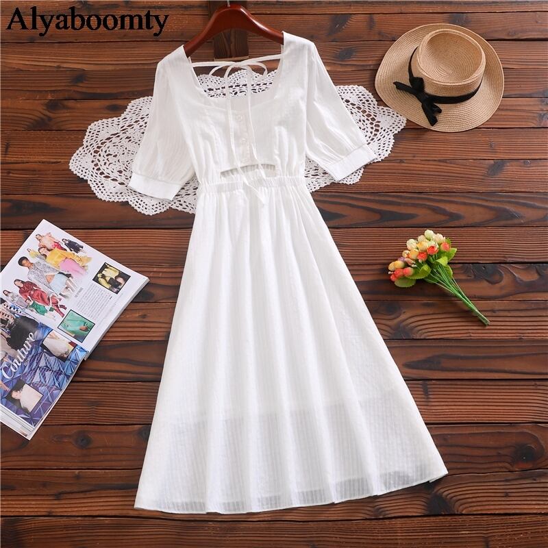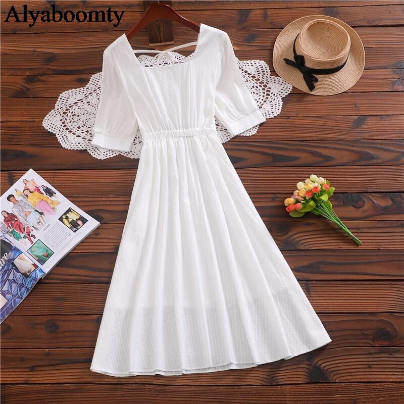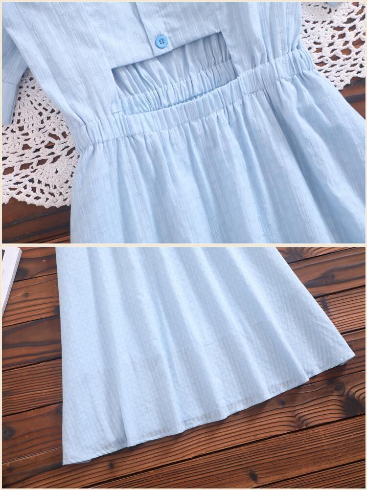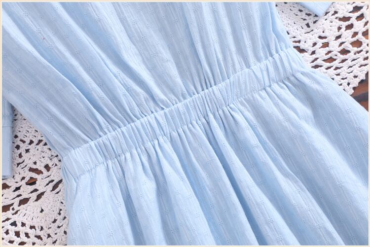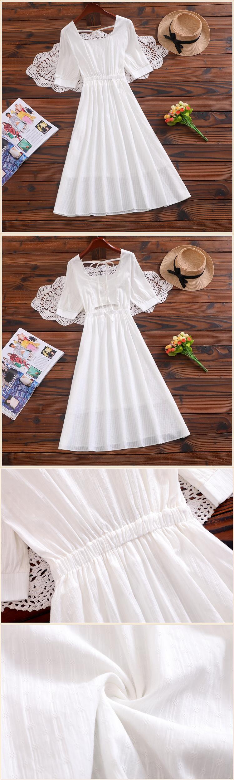 送料無料୨♥୧ 森サマーレディースミディドレス 平方カラーホワイトブルーバンドホローでるコットンパフスリーブ AOS77556118559