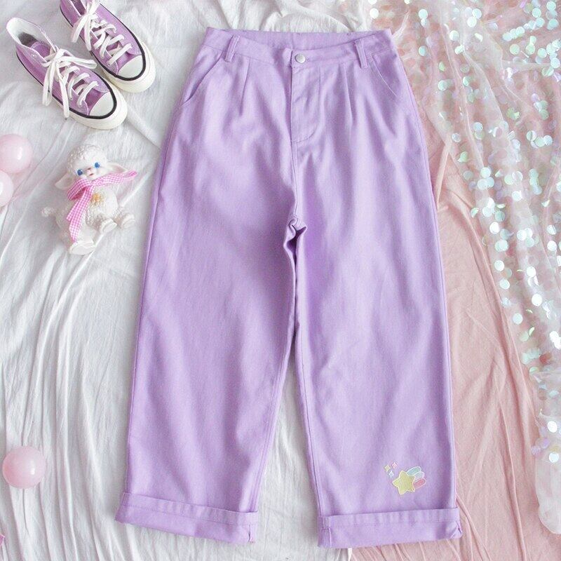 送料無料୨♥୧ ese原宿レディースワイドレッグパンツ ウェスト漫画プリント柄ルーズズボン可愛い紫のコットンロリータとベルト AOS17287785046