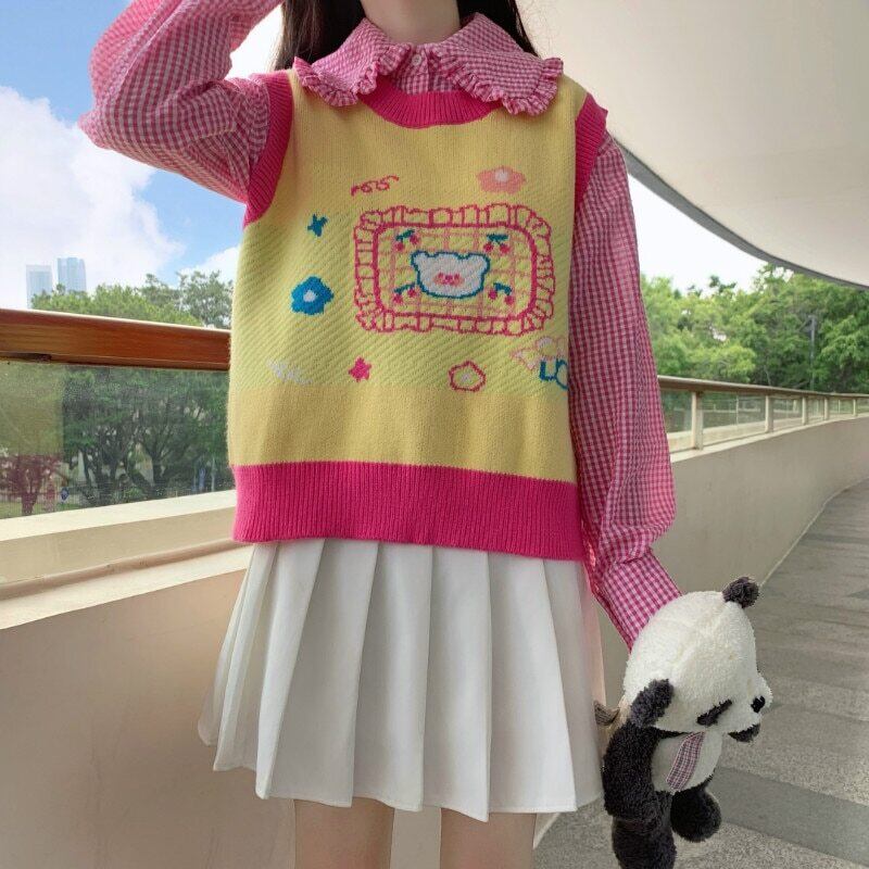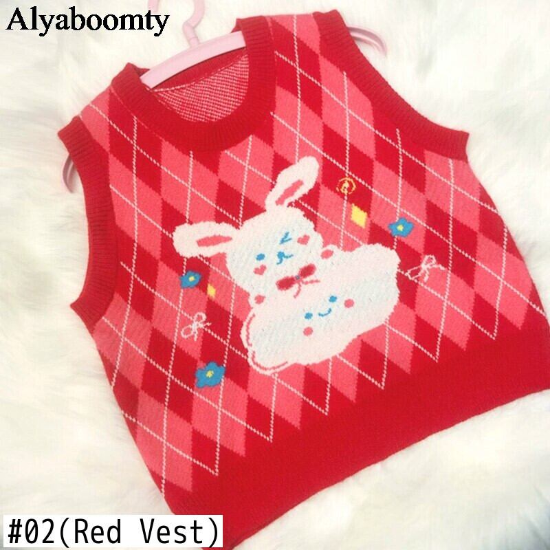 送料無料୨♥୧ eseプレッピースタイルオータムウィンターノースリーブレディースセーター バニーフローラルニットベスト可愛いクリスマスレッド AOS83770839610