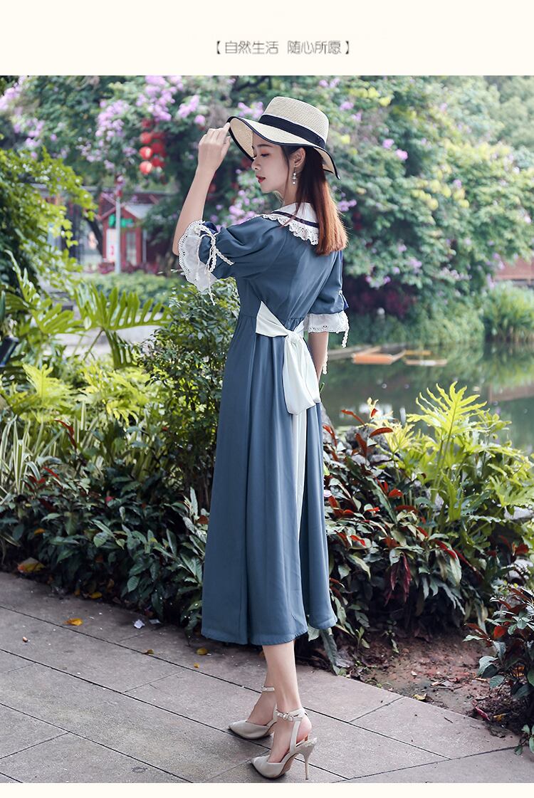 送料無料୨♥୧ 2021プレッピースタイルサマーレディースロングシャツ ドレス ピーターパンカラーヴィンテージフレアスリーブとレースシック AOS27680630359