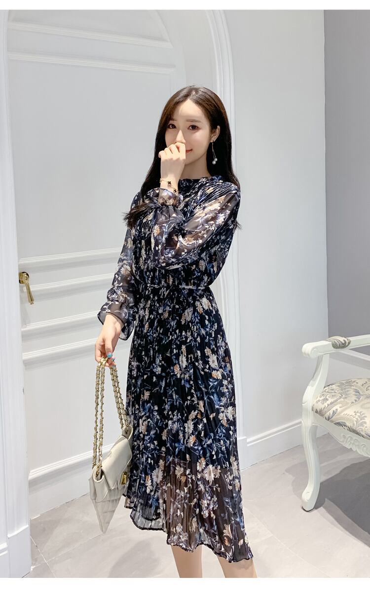 送料無料୨♥୧ スタイルオータムスプリングレディースフローラルドレス スタンドカラーカラーブルーブラックプリントベスティドス草原シックシフォンミディドレス ワンピース AOS58206218386