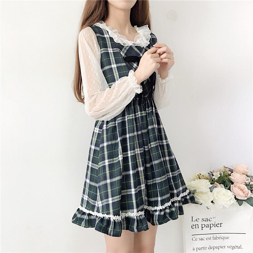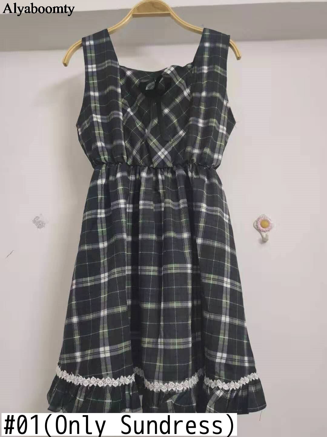 送料無料୨♥୧ eseプレッピースタイルスプリングサマーレディースドレス 格子柄ノースリーブ可愛いフリルかぎ針編みリボンのドレス ワンピース AOS43702219957
