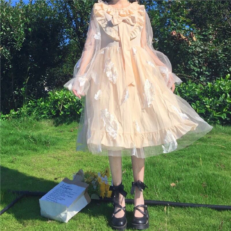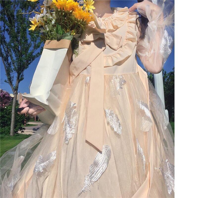 送料無料୨♥୧ eseロリータスタイルスプリングオータムレディースドレス リボンフェザー刺繍メッシュフレアスリーブ可愛いフリル妖精ドレス ワンピース AOS83821774593
