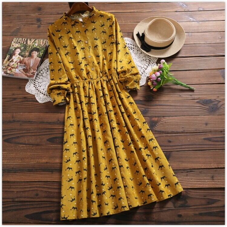 送料無料୨♥୧ 2021森スプリングレディースドレス カラーイエローコーデュロイヴィンテージ甘いレディミディ AOS85880136392
