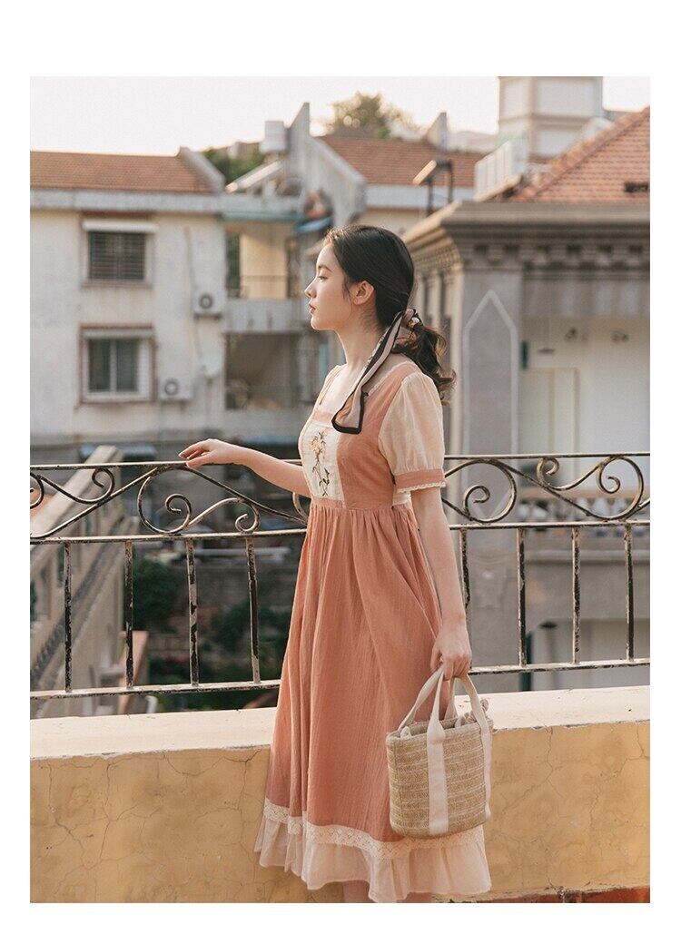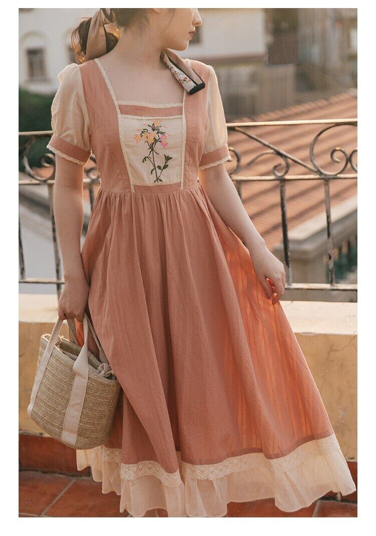 送料無料୨♥୧ 2021サマーレディースフランス語ロマンチックロングドレス 平方カラーパッチワークヴィンテージクリカルフローラル刺繍フリル AOS54461620787