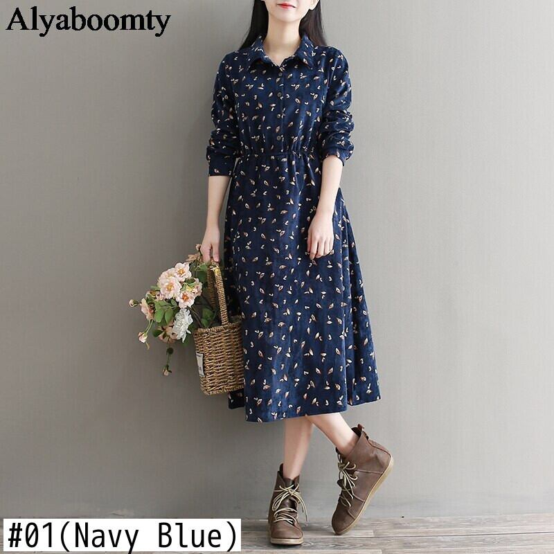 送料無料୨♥୧ オータムスプリングレディースミディコーデュロイドレス 断るカラー葉プリントベスティドス森ヴィンテージネイビーブルー甘い AOS13004048001
