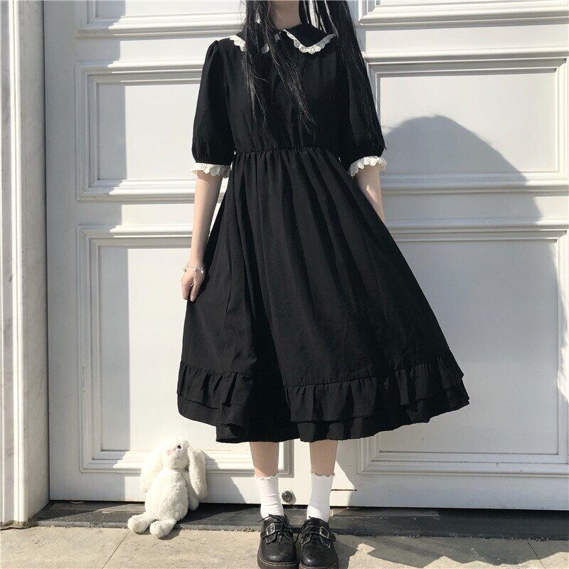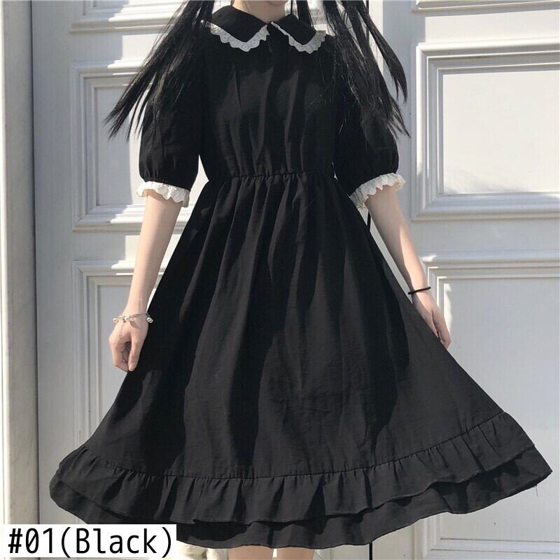 送料無料୨♥୧ 2021サマーレディースブラックロリータミディドレス 断るカラーとレースゴシック原宿フリル AOS56890255037