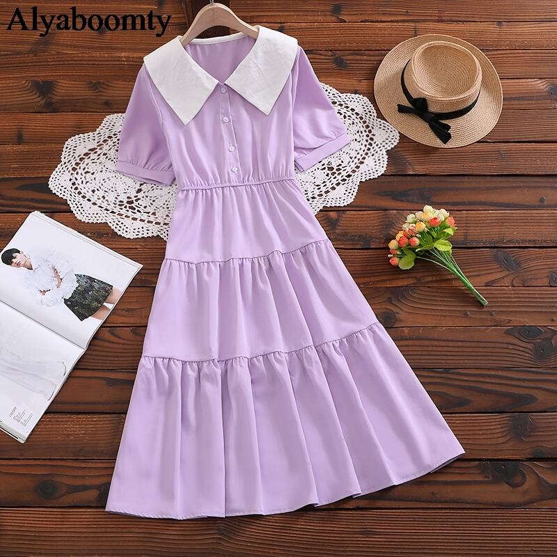 送料無料୨♥୧ キャンディーカラーサマーレディース森ミディドレス ピーターパン紫のグリーン半袖スリーブフリル AOS91492764821