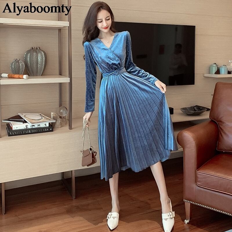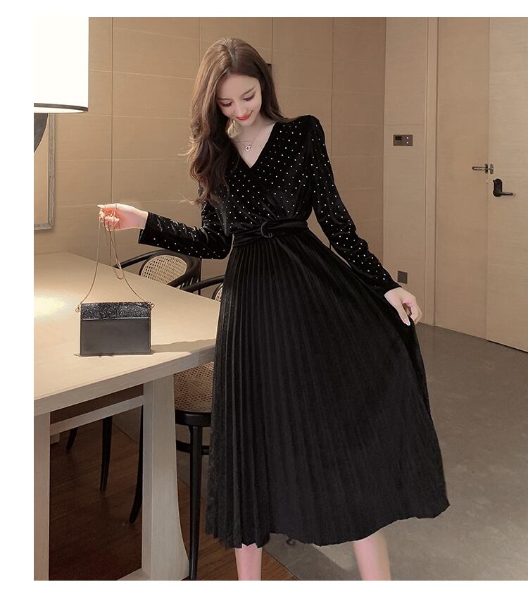 送料無料୨♥୧ シックオータムウィンターレディースミディドレス Vネックブラックブルーサッシダイヤモンドベルベット事務所レディパーティープリーツ AOS54624862629
