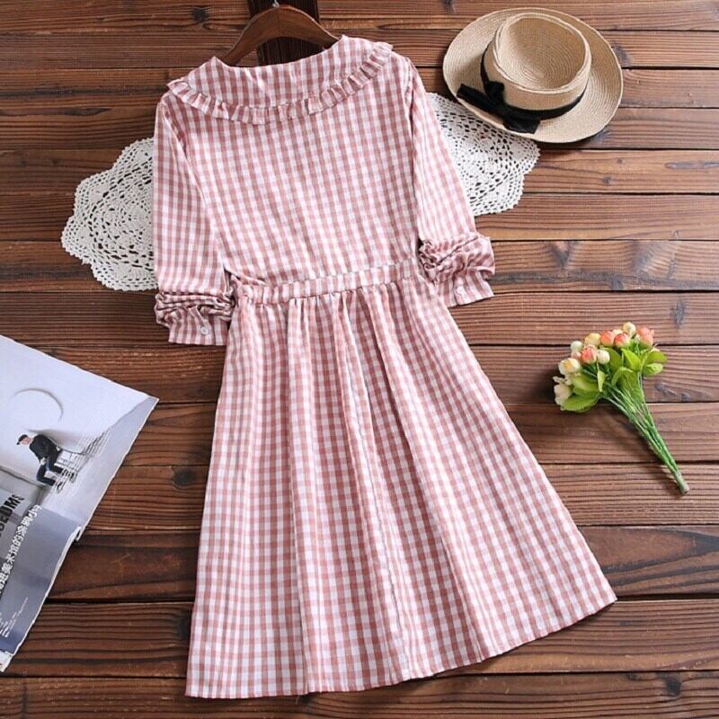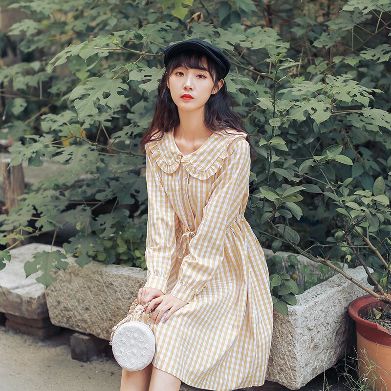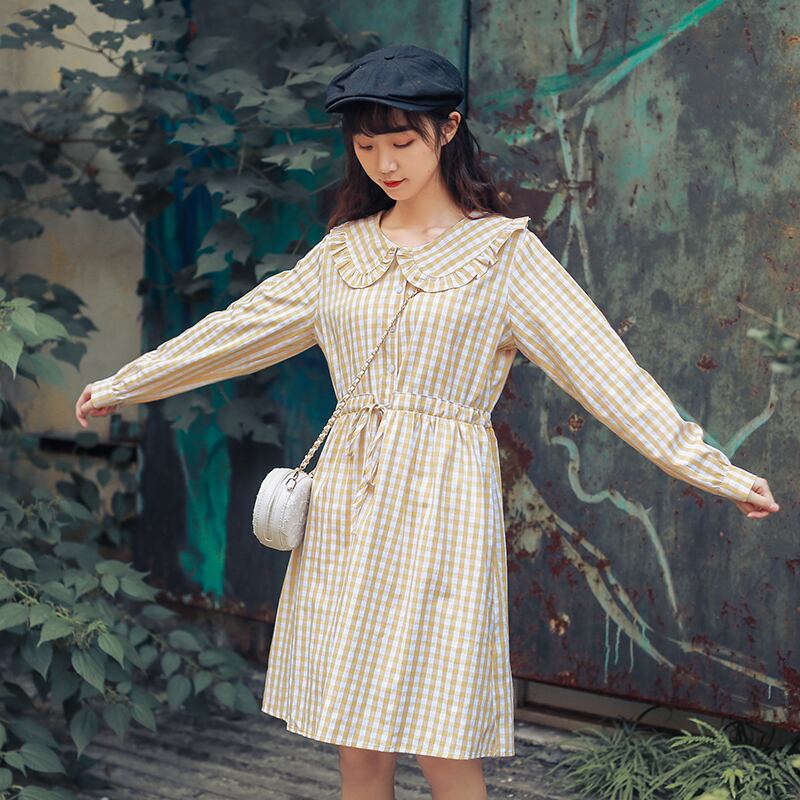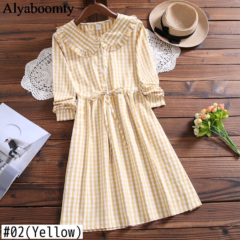 送料無料୨♥୧ eseプレッピースタイルオータムスプリングレディースドレス ピーターパンカラーピンクイエロー格子柄レースアップvestido可愛い長袖スリーブ AOS40542209479