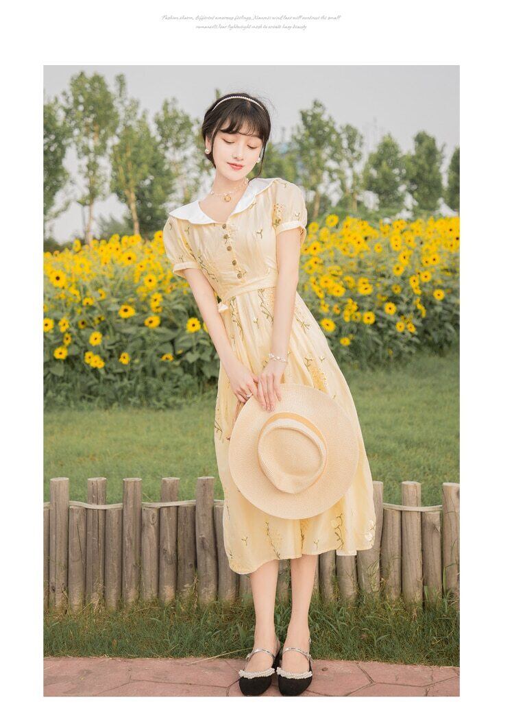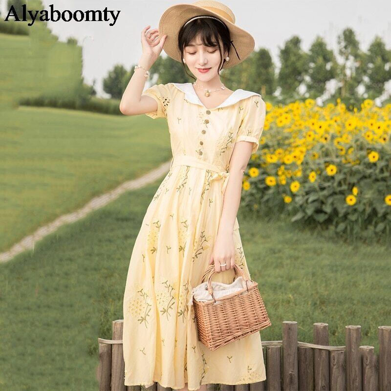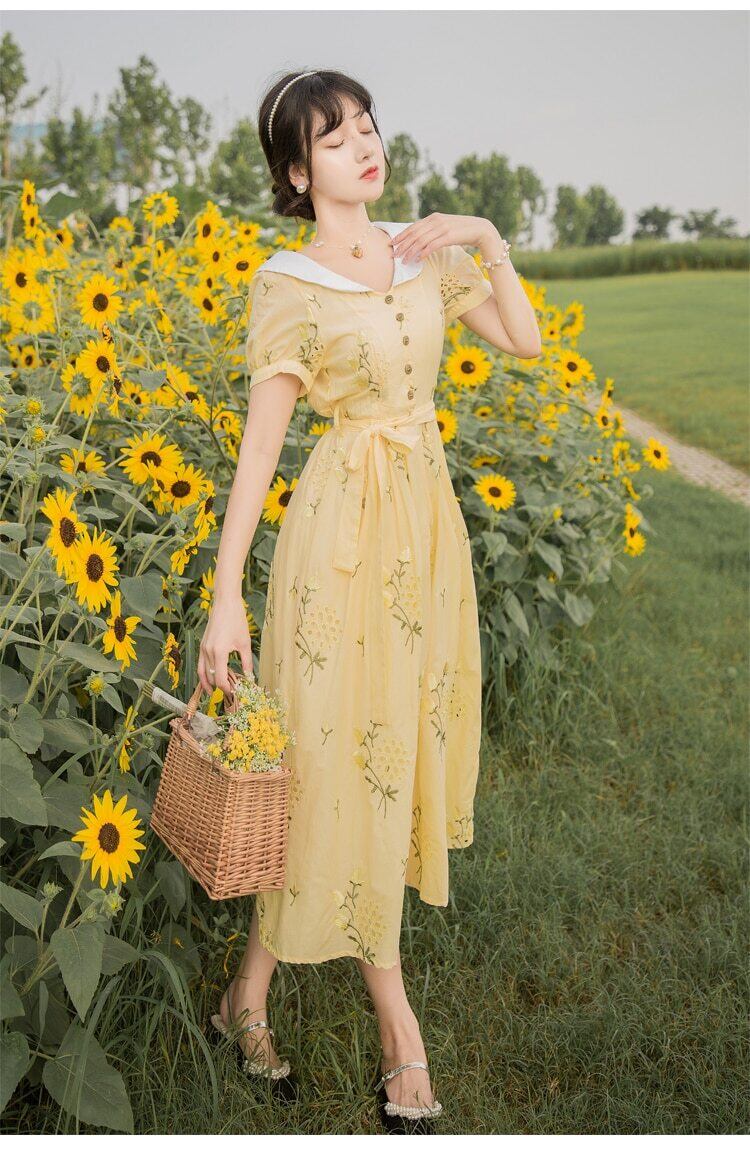 送料無料୨♥୧ ese森サマーレディースミディドレス ピーターパンカラーイエローフローラル刺繍甘いシックパーティーサッシ AOS55666706721
