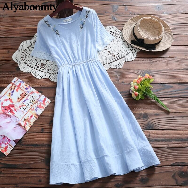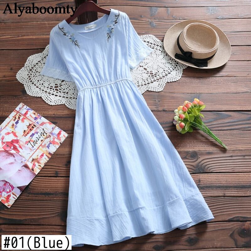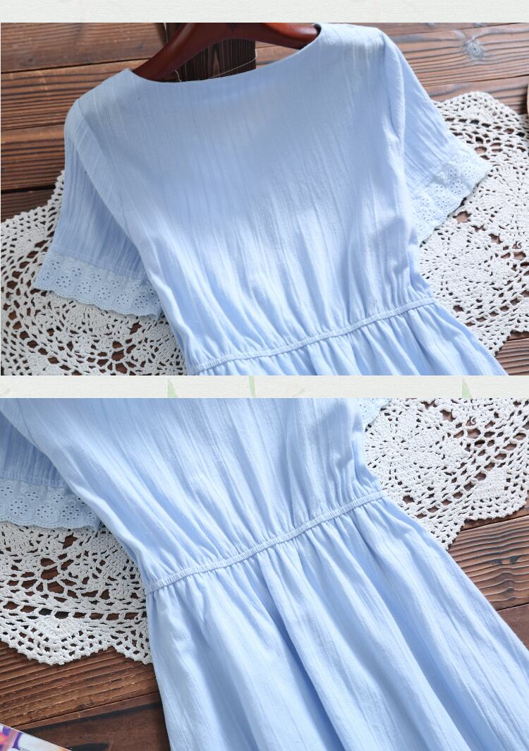 送料無料୨♥୧ 森サマーレディースコットン可愛いドレス Vネックブルーアプリコットフローラル刺繍ホローでるジャカードヴィンテージドレス ワンピース AOS45477271672